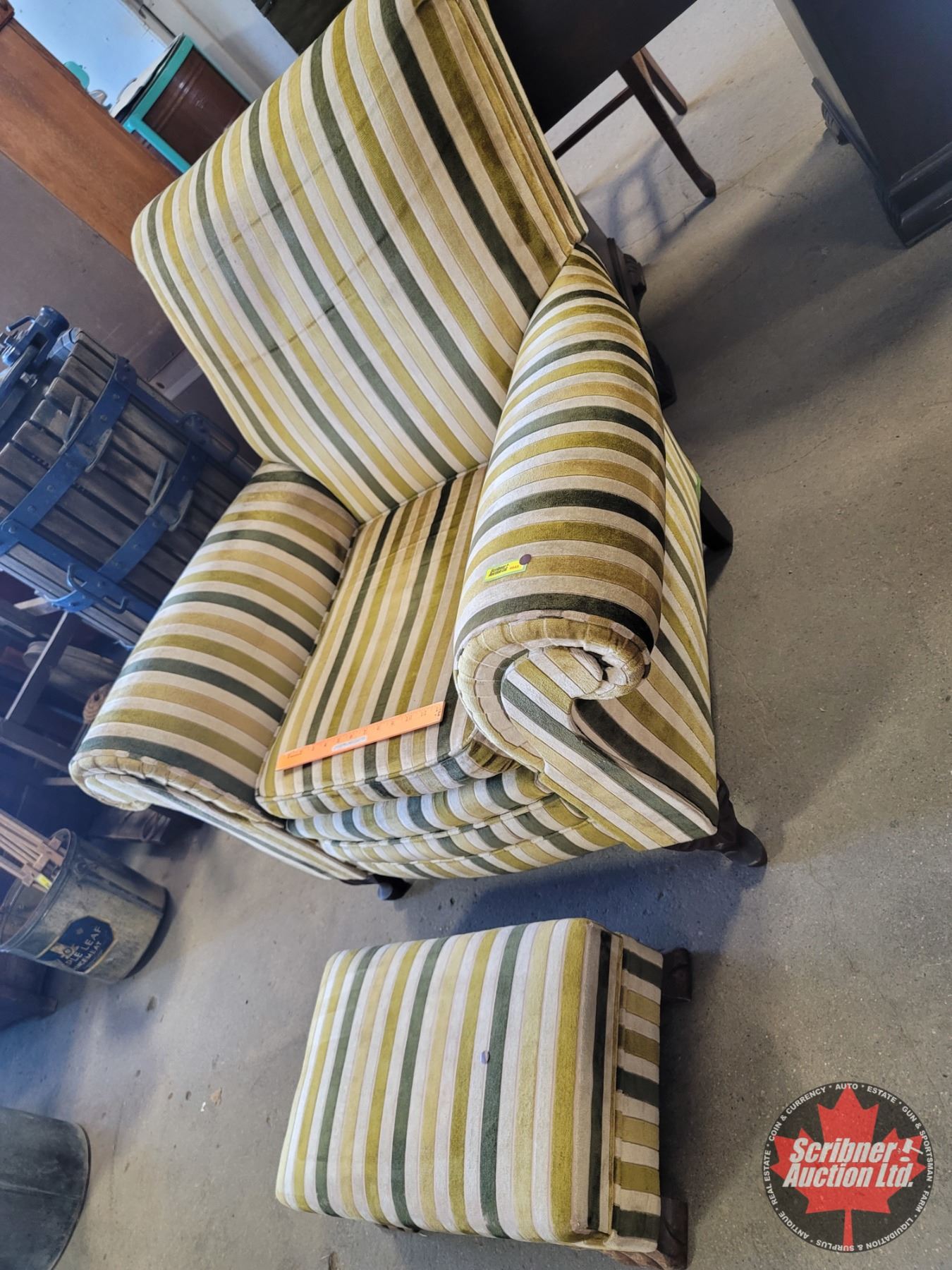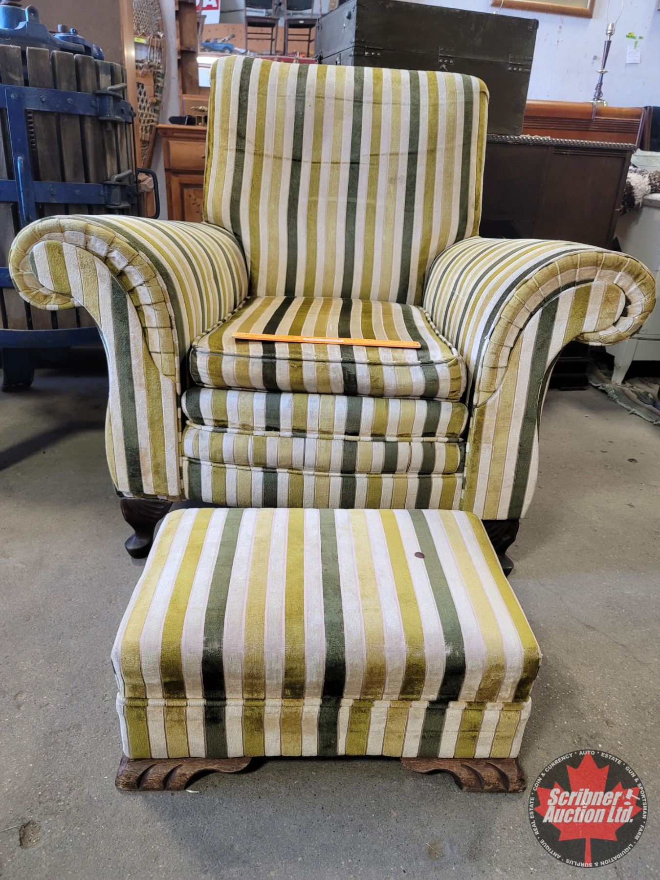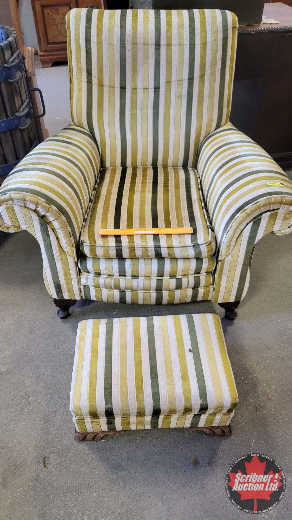 Striped Arm Chair with Footstool (Chair Measures: 35"H x 38"W x 35"D) (Needs Cleaning / TLC) (SEE PICS!)