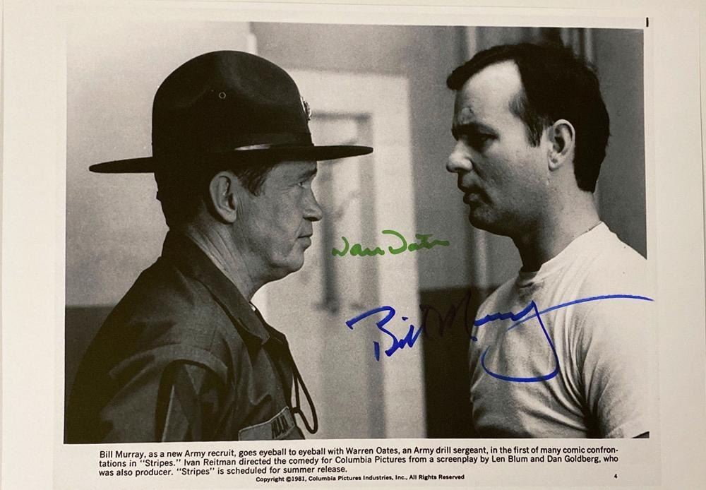 Stripes Warren Oates and Bill Murray facsimile signed movie photo. 8x10 inches. This item is a reprint of an original autograph