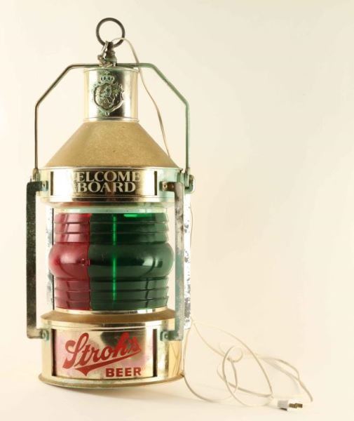 Plastic construction made to look like brass with a green light on one side and red on the other. Reads "Welcome Aboard From One Beer Lover To Another". Measures 25"h x 10" dia. Meant to hang, unknown working condition.