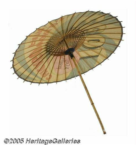 <B>Stroll with this Chicago World's Fair Umbrella</B></I> In excellent condition. Made like a Japanese party umbrella with bamboo type stays, this umbrella was a souvenir of the 1939 Chicago World's Fair and is the size of a regular umbrella. From the material it is made of it is amazing this piece survived and in <I>excellent</B></I> condition. Super graphic logo of the World's Fair when opened. Lot:254