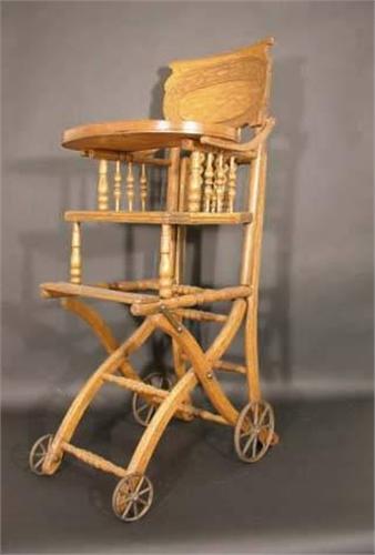 Stroller/highchair, turn of the century, pattern back, 40" tall, barley twist, cane seat, cast iron wheels, ex. cond.