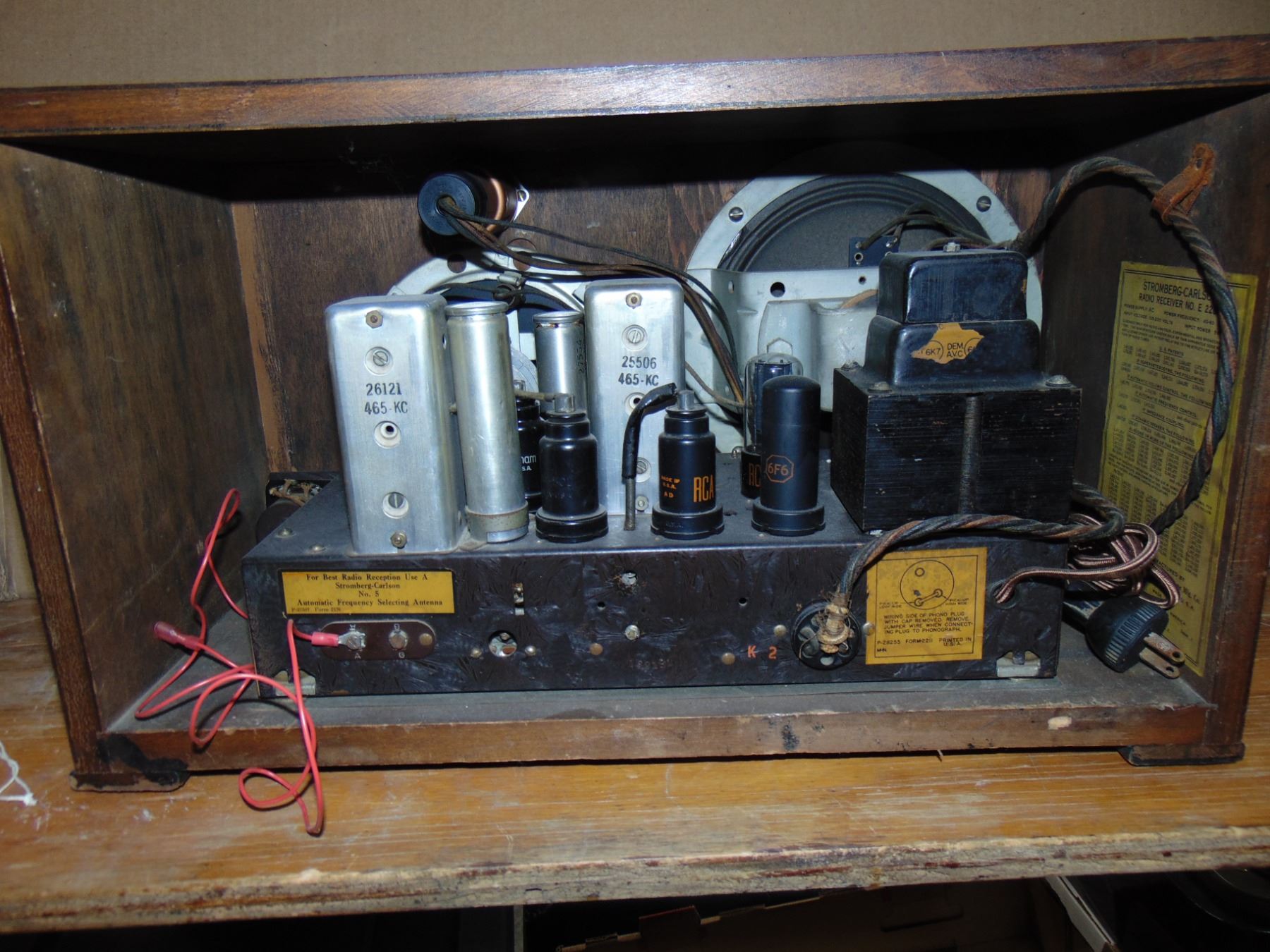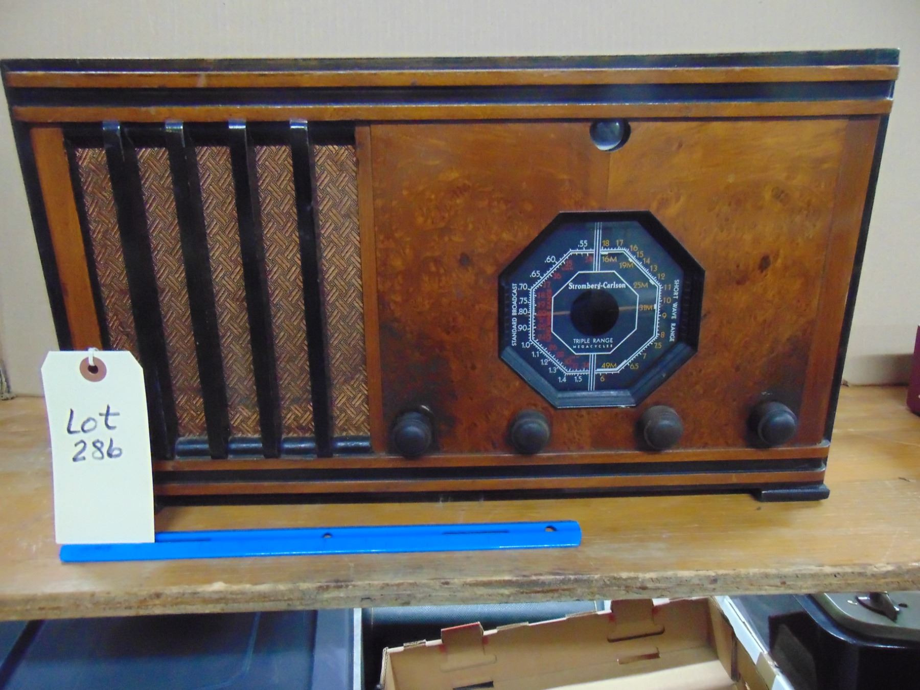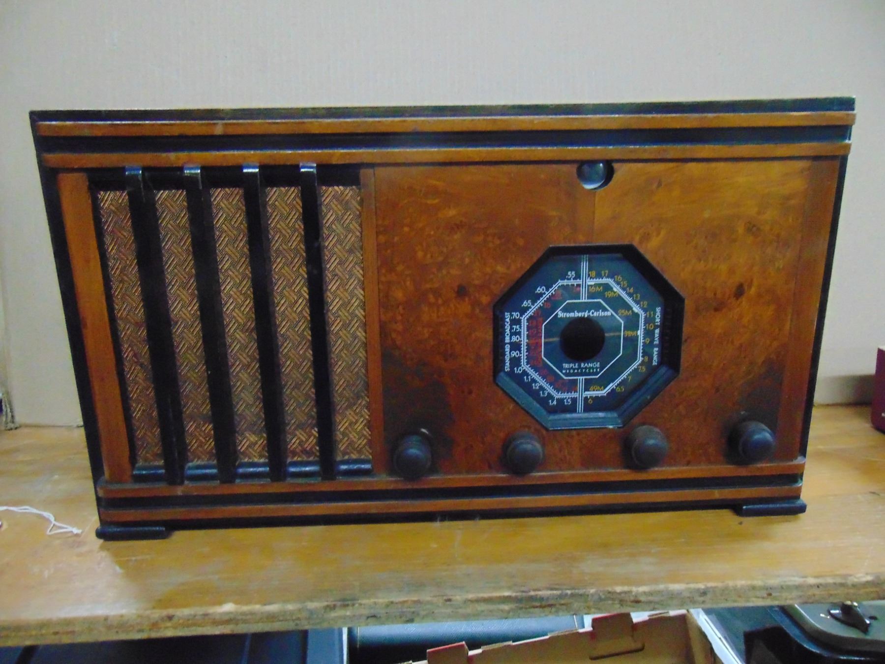 Stromberg Carlson wood table set; model E228; restored in and out; very nice condition; works; octogon dial with tuning eye; AM/SW