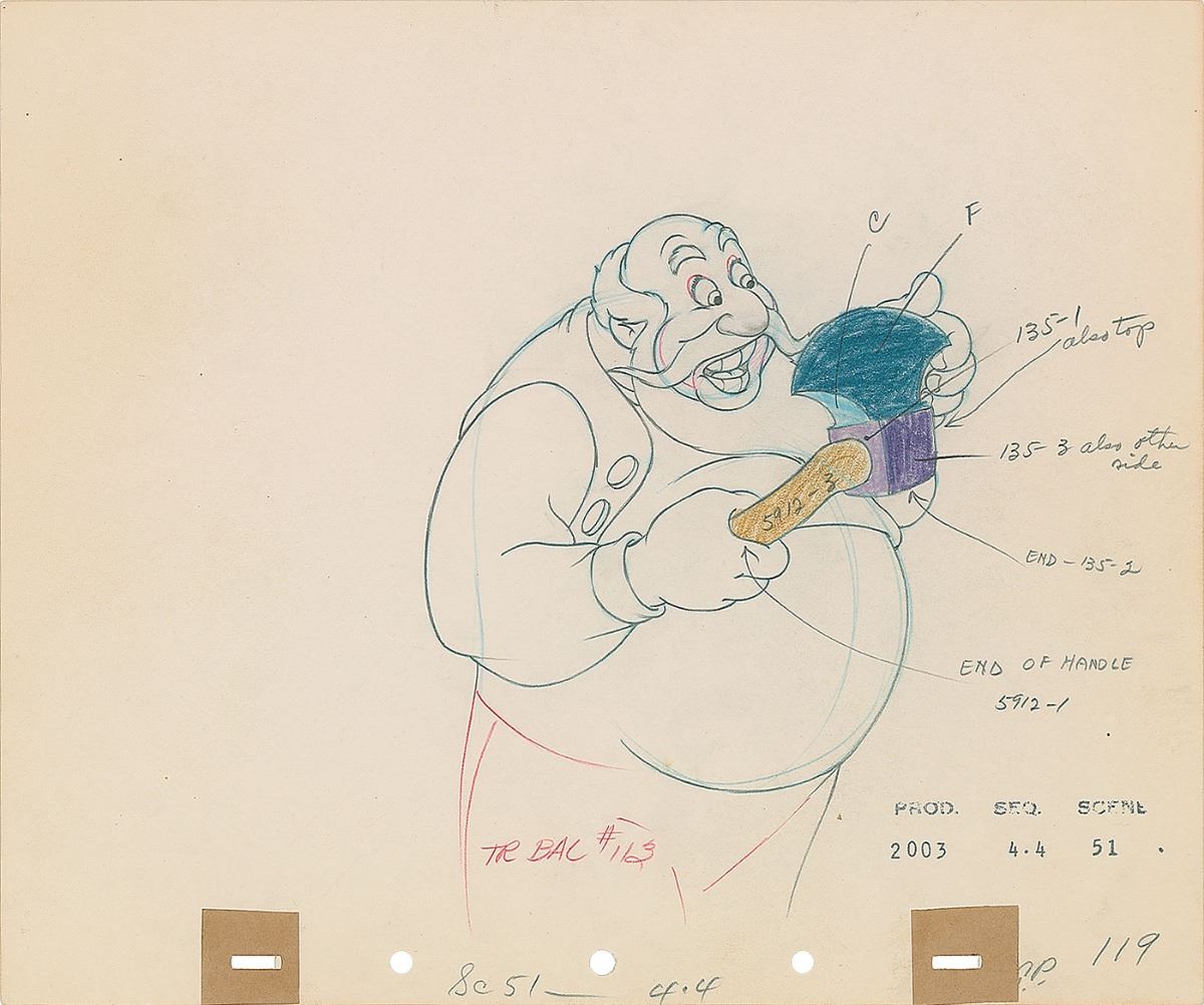 (Walt Disney Studios, 1940) Original production drawing featuring Stromboli from Pinocchio, showing the imposing figure inspecting the sharp blade of his axe. Accomplished in graphite and colored pencil on untrimmed 12 x 10 animation paper. Image measures 5.5 x 7. In fine condition.