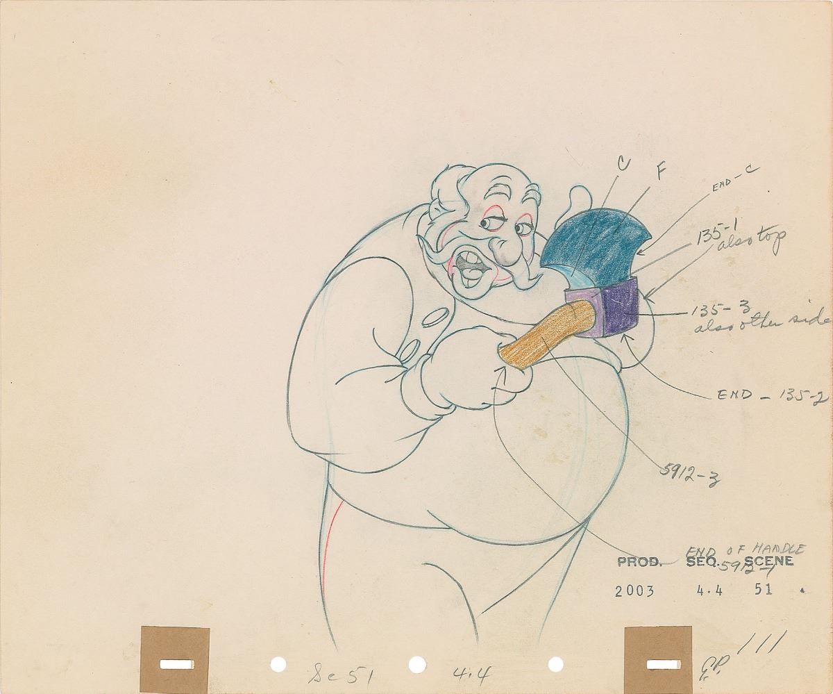 (Walt Disney Studios, 1940) Original production drawing featuring Stromboli from Pinocchio, showing the villain holding his axe. This also features the ‘color call out’ for the axe, referencing the exact colors to be used for that particular area of the painted cel. Accomplished in graphite and colored pencil on untrimmed 12 x 10 animation paper. Image measures 5.25 x 7. In fine condition.