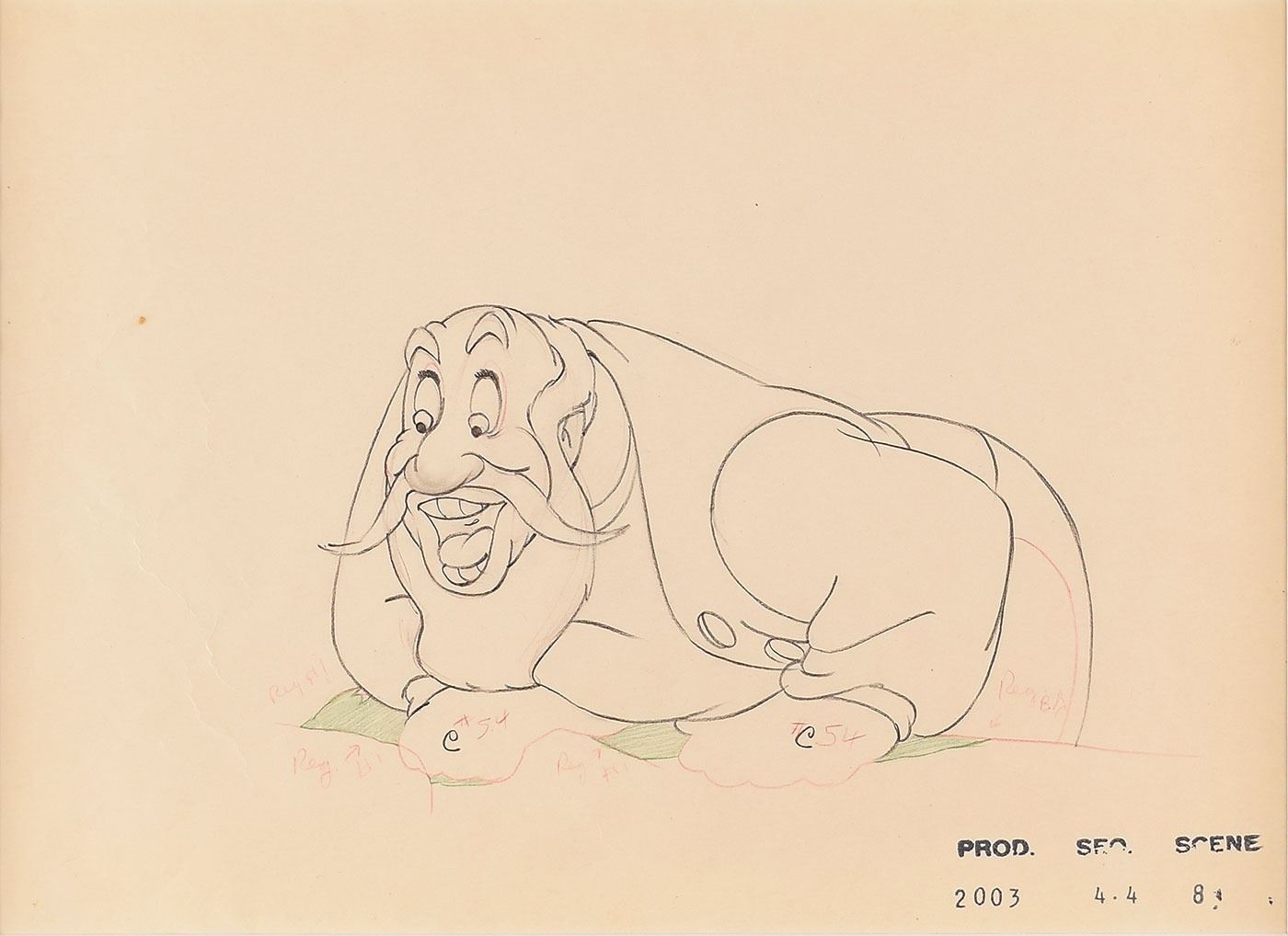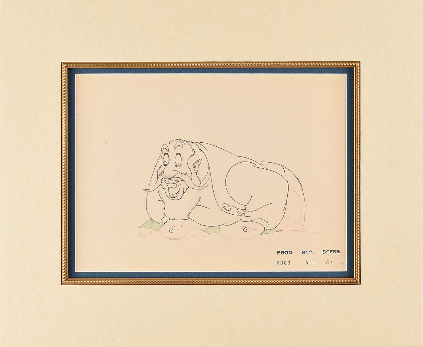 (Walt Disney Studios, 1940) Original production drawing featuring Stromboli from Pinocchio, showing the classic villain in the scene when he is talking with Pinocchio after his 'I've Got No Strings' performance. Accomplished in graphite and colored pencil on animation paper, stamped: "Prod. 2003, Seq. 4.4, Scene 8." Image measures 6.75 x 4, with a mat opening of 11 x 8. Double-matted to an overall size of 17 x 14. In fine condition.