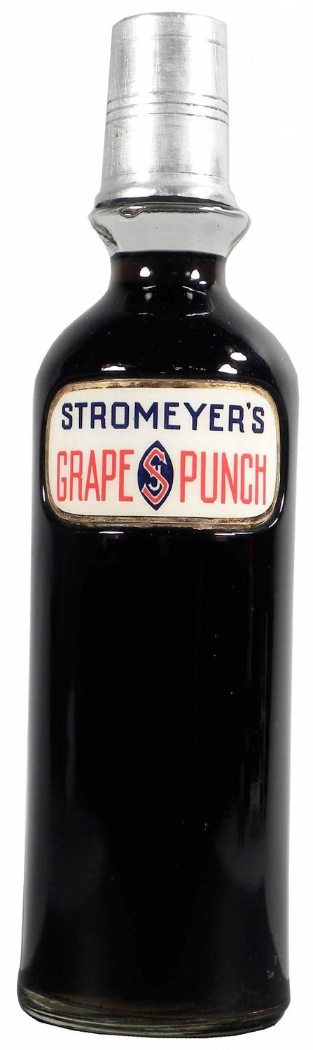 Stromeyer's Grape Punch, label under glass bottle. Metal shot top. Near mint condition. 12 1/2 inches tall.