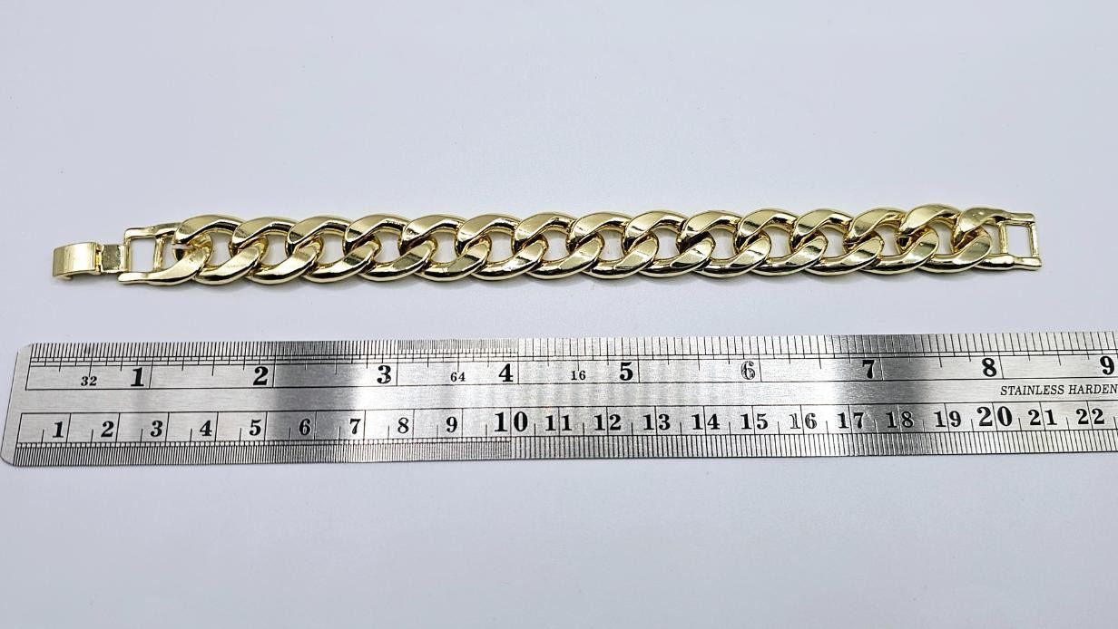 Strong and durable heavy 14k yellow gold plate curb link bracelet weighing 61.8 grams, 8" in length 15.6 mm wide, with a sturdy clasp.