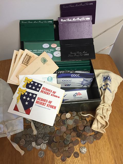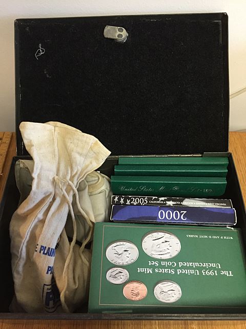 Strong box of estate coins, as found, includes mint and proof sets, pennies, nickels, silver quarter,
