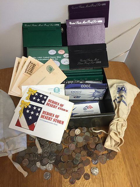 Strong box of estate coins, as found, includes mint and proof sets, pennies, nickels, silver quarter, etc.