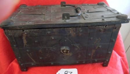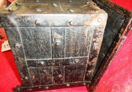 Early Spanish Strong Box, measures 12 by 8 by 8 inches. Lock broken, some rust. Circa 1700's. Shipping $25.00