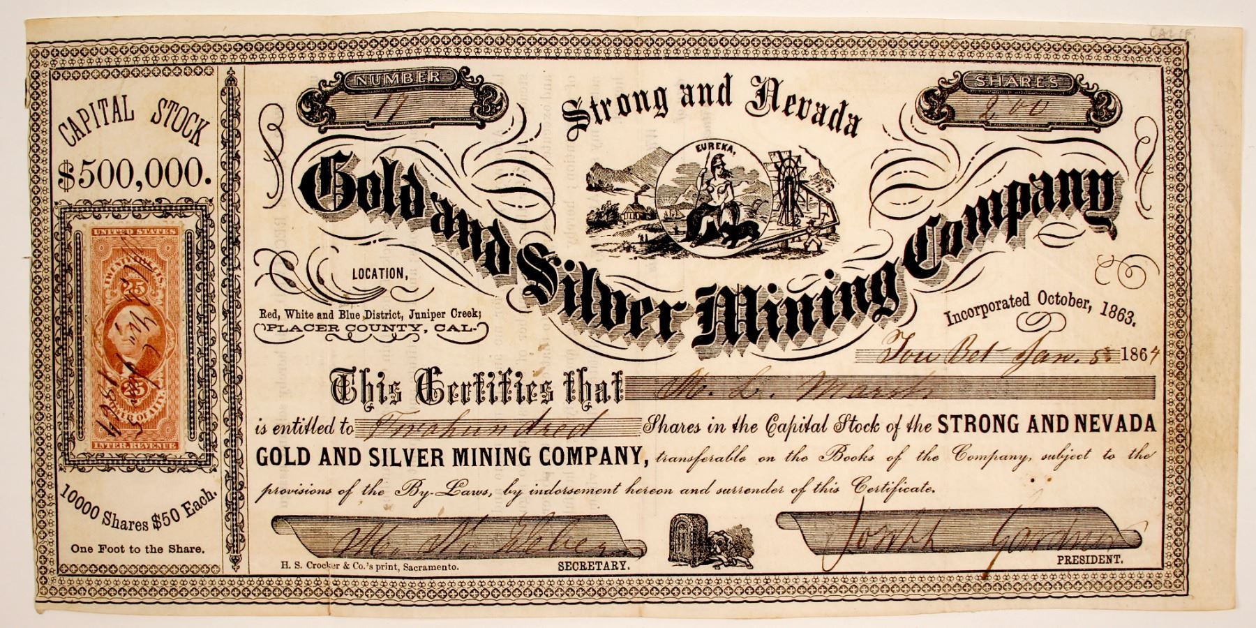 I/U #17 L Marks 200 shares 1864 signed by President Gardner. 25c revenue stamp. Eureka vignette. Mines in Red, White and Blue District, Juniper Creek, Placer County, California. Creases. No information was located about this company in our indexes or on CDNC.