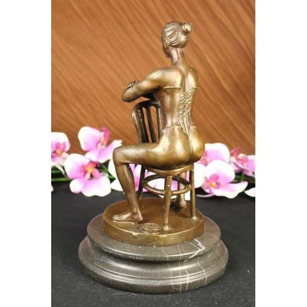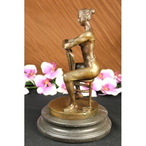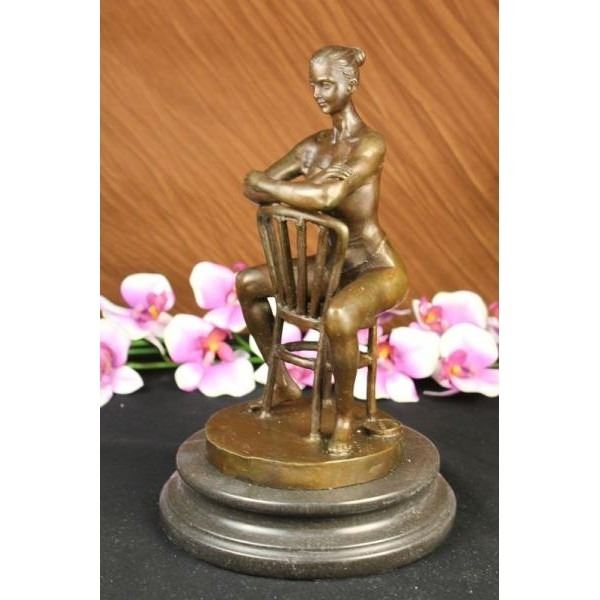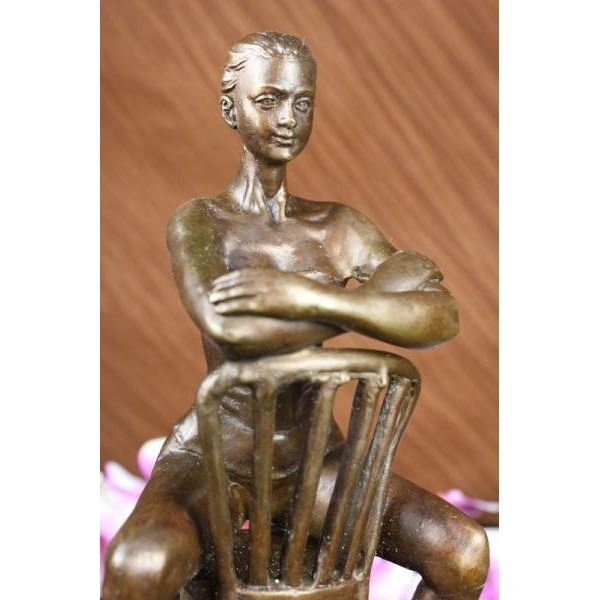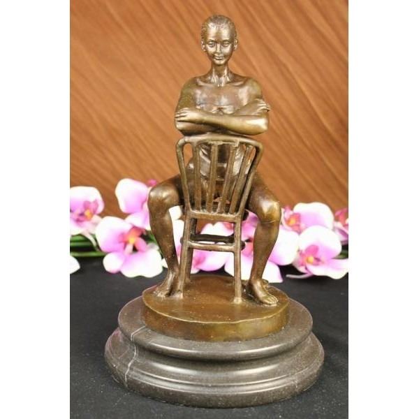 This lovely Sculpture of this powerful and strong woman sitting backwards on a chair, the way guys usually do to prove they are manly will leave you with a sense of strength. She smiles calmly and at the same time beautifully with her arms crossed one on top of the other over the head of the chair as she wears this tube top full upper body piece. Her strong and muscular legs and arms describe the hard labor she had to go through to get to where she sits. This confident Woman was cast using the Lost Wax Method. Bronze Dimensions with Marble Base: Height 11 X Width 7 inches. Weight: 10 LBS.
