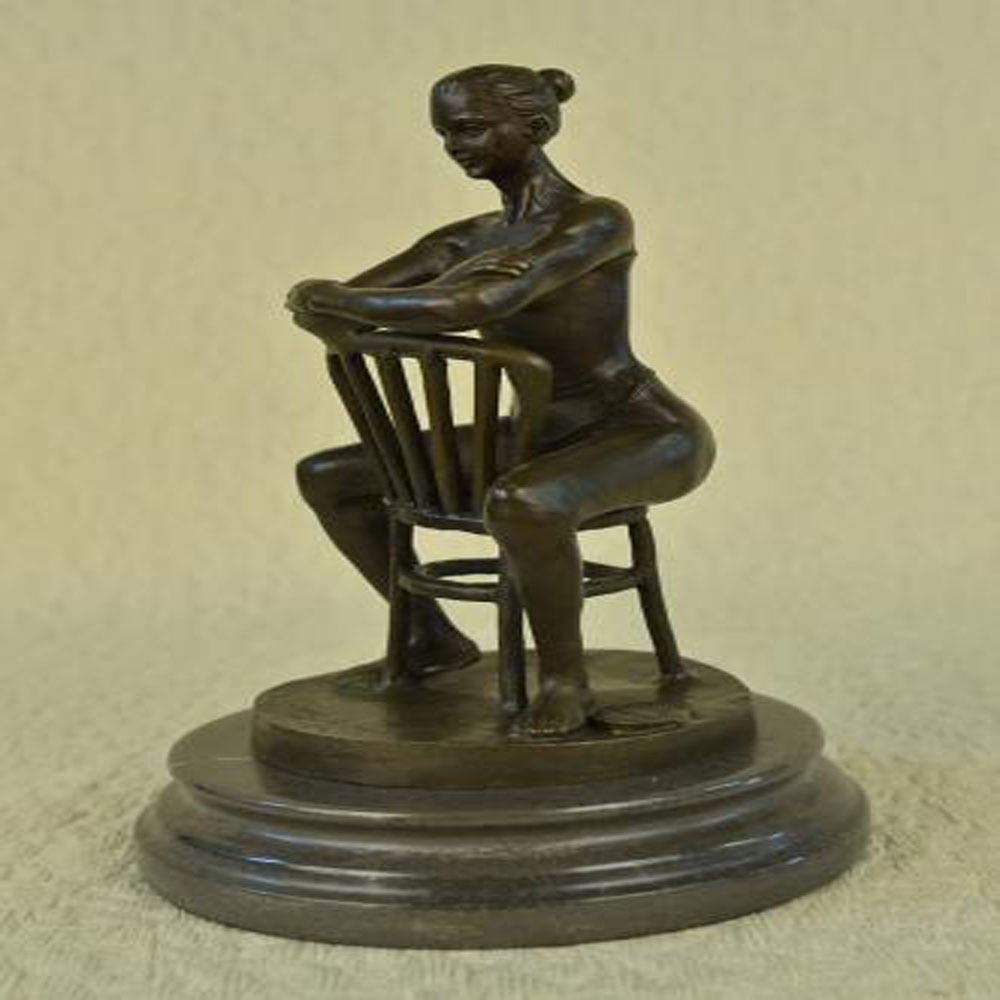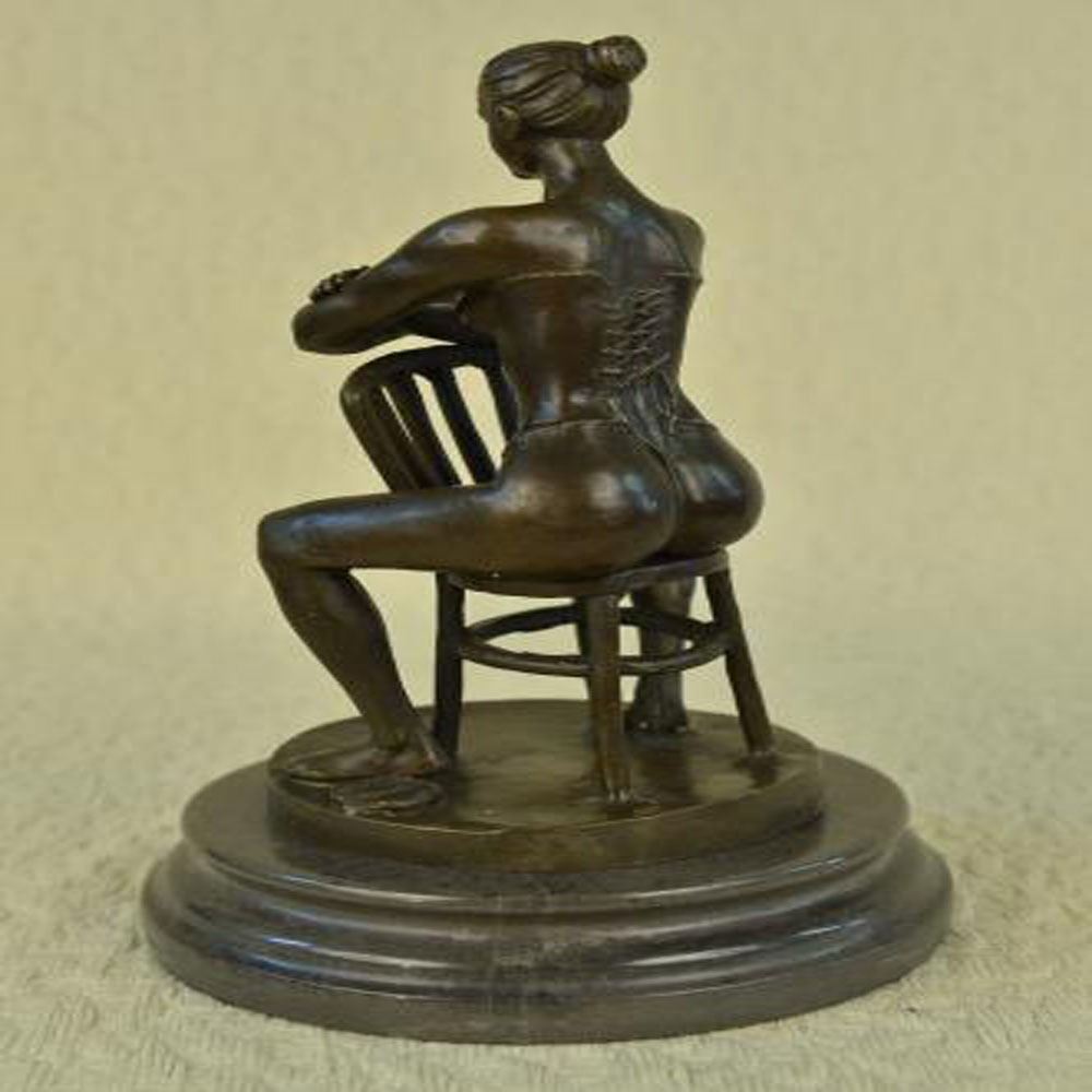This lovely Sculpture of this powerful and strong woman sitting backwards on a chair, the way guys usually do to prove they are manly will leave you with a sense of strength. She smiles calmly and at the same time beautifully with her arms crossed one on top of the other over the head of the chair as she wears this tube top full upper body piece. Her strong and muscular legs and arms describe the hard labor she had to go through to get to where she sits. This confident Woman was cast using the Lost Wax Method. Bronze Dimensions with Marble Base: Height 11 X Width 7 inches. Weight: 10 LBS.