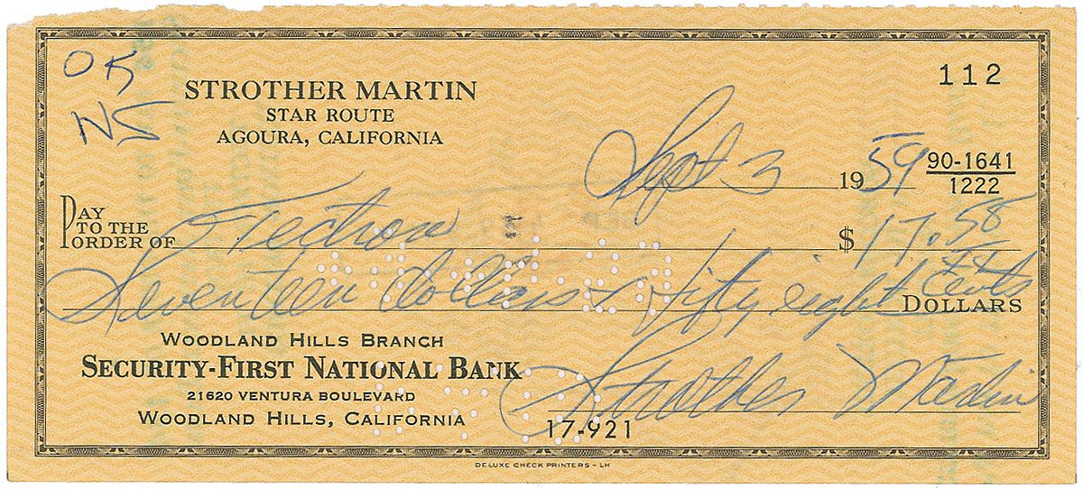 Character actor (1919–1980) who appeared in such classics as Butch Cassidy and the Sundance Kid and Cool Hand Luke, in which he uttered the famous line, ‘What we've got here is...failure to communicate.’ Personal check, 6 x 2.75, filled out and signed by Martin, payable to Tectron for $17.58, September 3, 1959. Cancellation holes affecting part of first letter in signature, expected bank stamps and notations, and slight paper loss to upper left edge, otherwise fine condition.