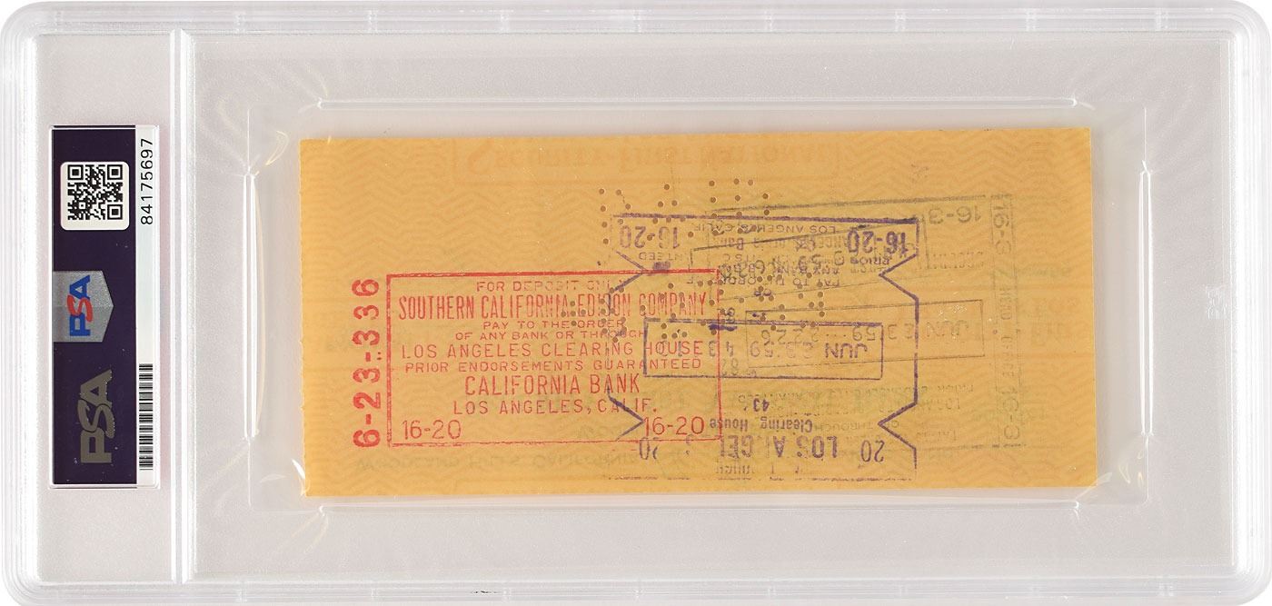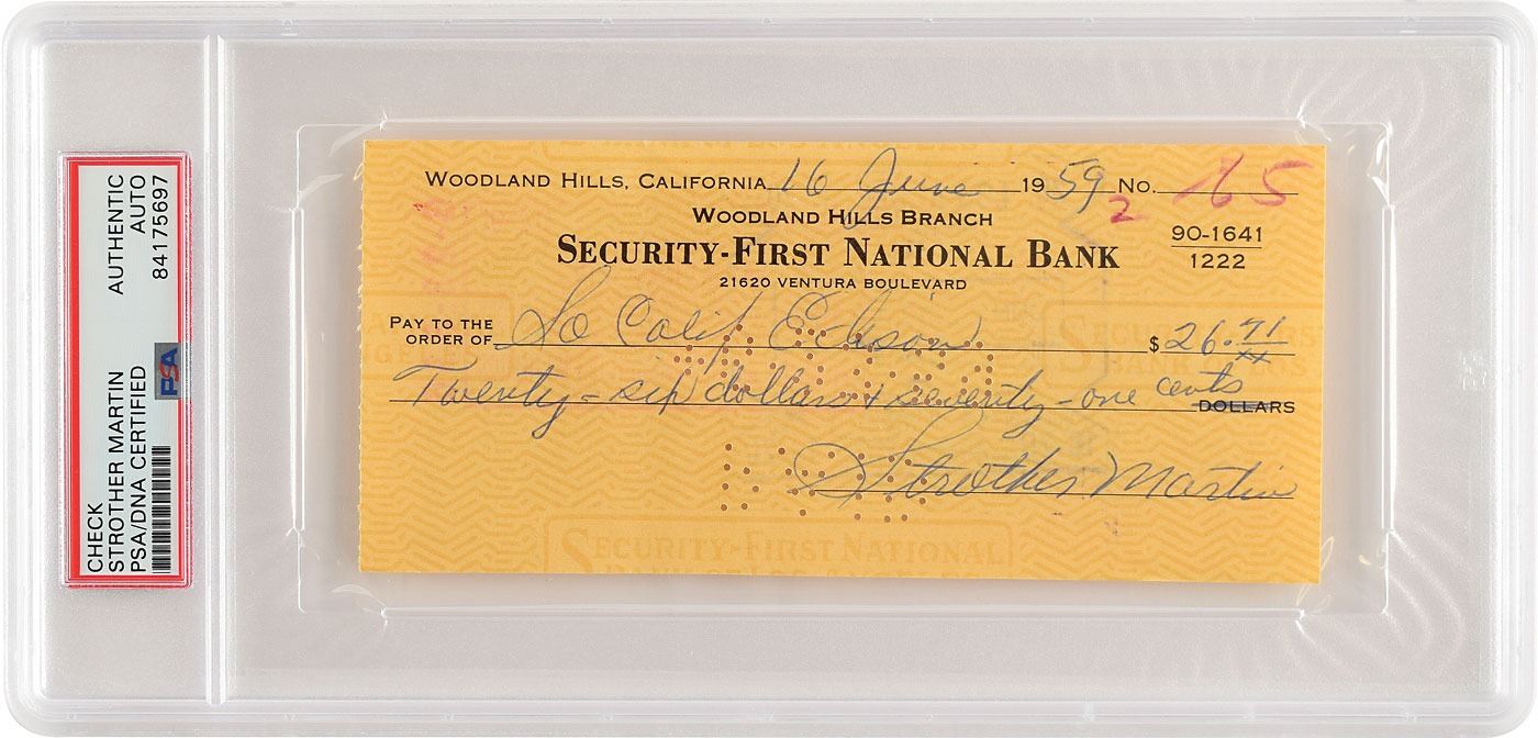 Security–First National Bank check, 6 x 2.75, filled out and signed by Strother Martin, payable to So. Calif. Edison for $26.71, June 16, 1959. In fine condition. Encapsulated in a PSA/DNA authentication holder.