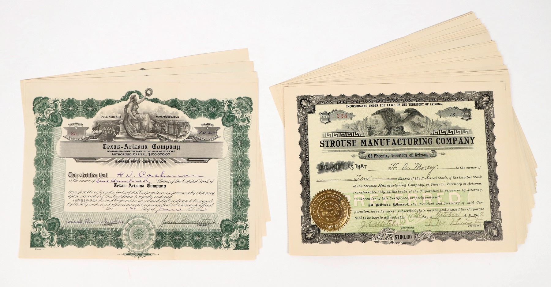 There are over 25 preferred stock for the Strouse Manufacturing Company dated 1907. All are issued to H.A. Morey. Please see photo for details.