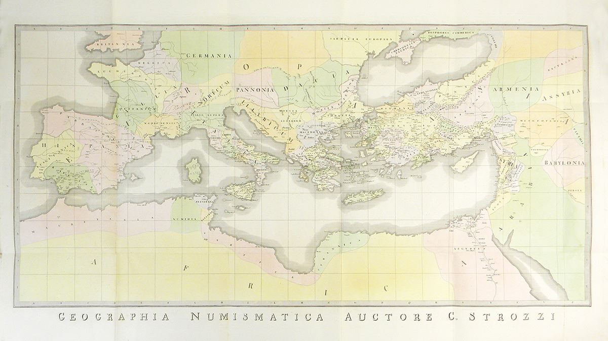 Strozzi, Carlo. QUADRO DI GEOGRAFIA NUMISMATICA DA SERVIRE ALLA CLASSIFICAZIONE GEOGRAFICA ... Firenze, 1836. 4to, original printed wraps. vi, (2), 103, (1) pages; extremely large [105.5 by 54.5 cm] linen-backed colored folding Geographia Numismatica map. Spine split at junction of text and map; untrimmed page edges curled. Very good; map near fine. See catalogue for full description.