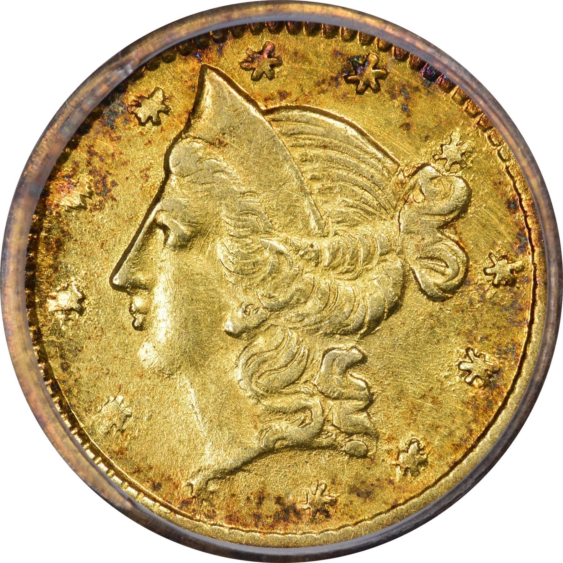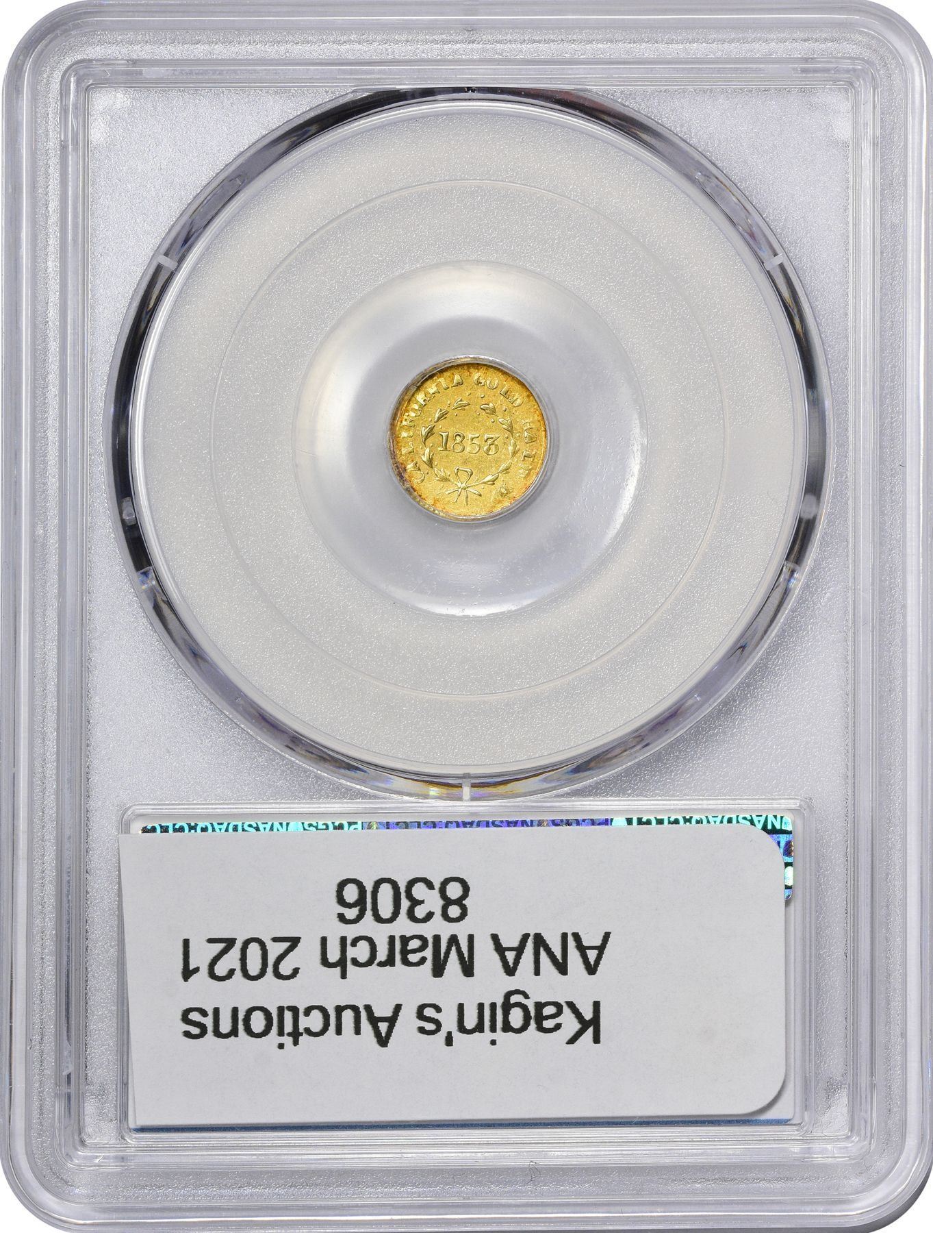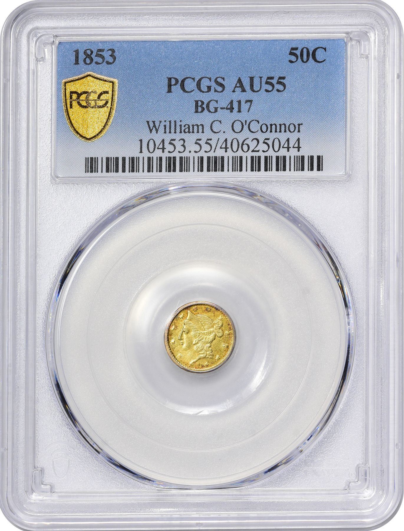 Description: 1853 round Half D, BG-417, Die State II (rusty dies, obverse crack joins three stars above head). Same obverse die, heavily rusted and cracked; CALIFORNIA GOLD HALF D, 12 berries on each branch of wreath, all paired except top left, between A G. PCGS AU55. Attributed to Deriberpie (and associates?). Light peripheral toning both sides. PCGS AU55 William C. O’Connor (PCGS# 10453).