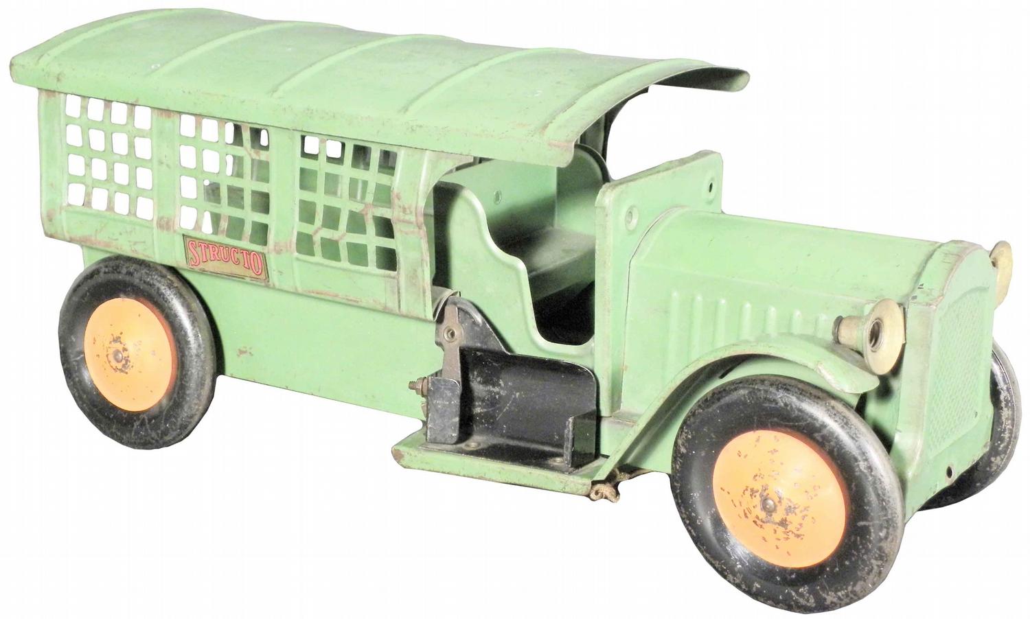 Structo Pressed Steel Delivery Truck. Green with orange wheels. Most of original paint intact. Normal wear otherwise very good condition. 15 1/4 inches long.