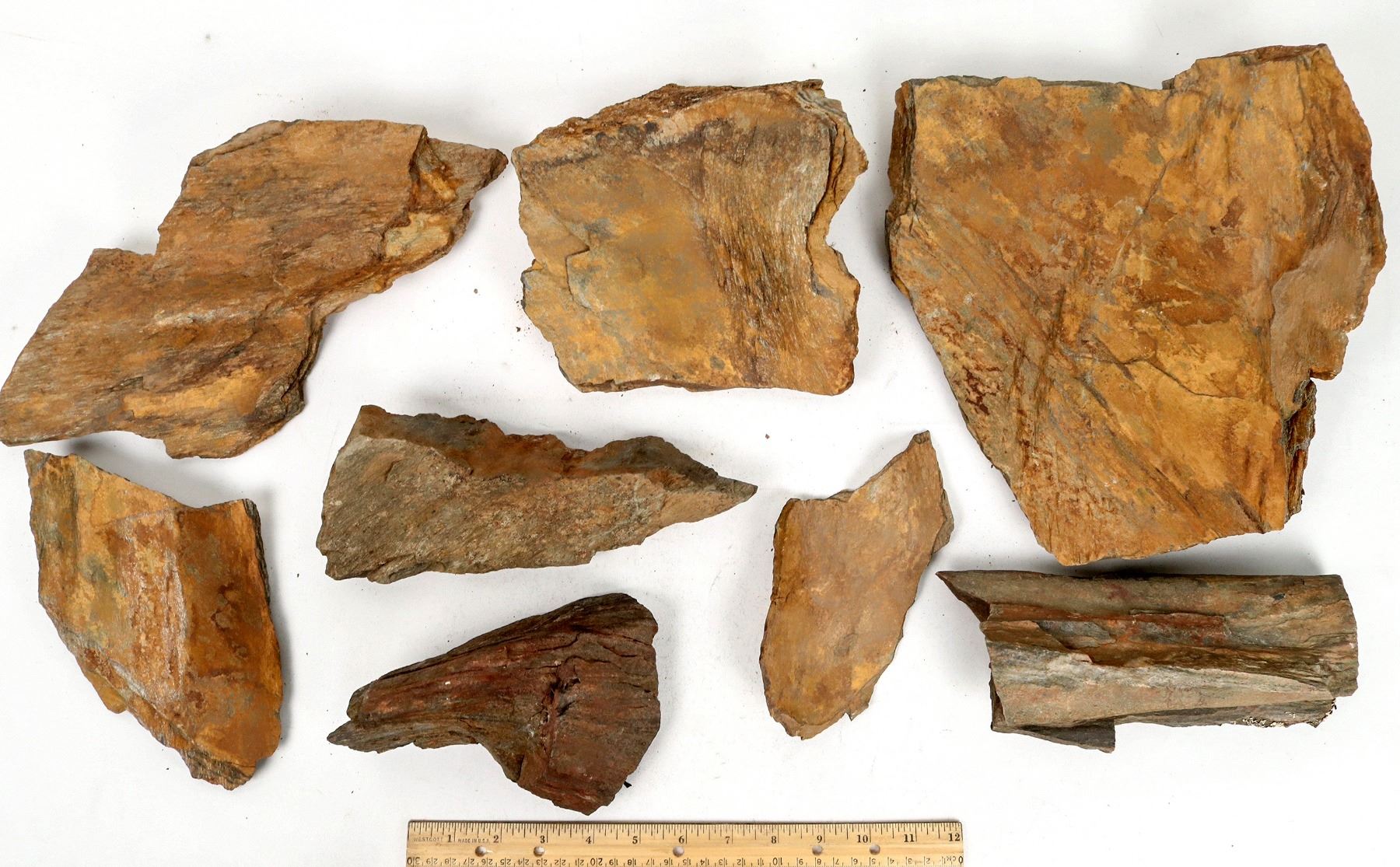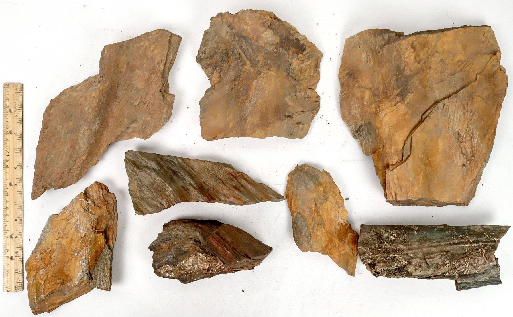Group of approx. 6 specimens of the Poorman Formation at the surface at the Homestake Mine. These specimens were all collected by Shaddrick to illustrate the intense nature of folding and subsequent mineralization. Understanding the structure at the Homestake Mine was critical in understanding ore deposition. These specimens probably don't contain gold, but rather illustrate an important feature. Specimens range from 12 x 12 x 6" down to 3 x 3 x 9" approx. About 17lbs.