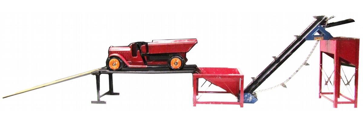 Strutco Pressed Steel Toy Sand and Gravel Factory. Very good original condition. 9 pieces in set. 68 inches long overall.