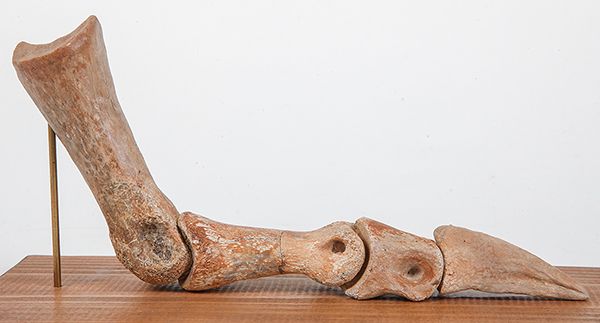 Struthiomimus Toe With Claw. Struthiomimus (name means ostrich mimic) was a fast running bipedal ostrich-type dinosaur that lived in Eastern Montana 70-75 million years ago. It is estimated that this dinosaur could run at speeds between 30-50 mph. This medium size plant eating or omnivore dinosaur was about 14 feet long and most likely was feathered. This complete toe with metatarsal bone is 11 inches long with the only restoration being the upper half of the metatarsal bone. The sharp claw is 2.5 inches long and would have been quite an effective weapon being kicked at high speed at a predatory dinosaur. Has been mounted on a 12 x 5 inch wooden base making for an excellent display. From a private ranch in Eastern Montana.