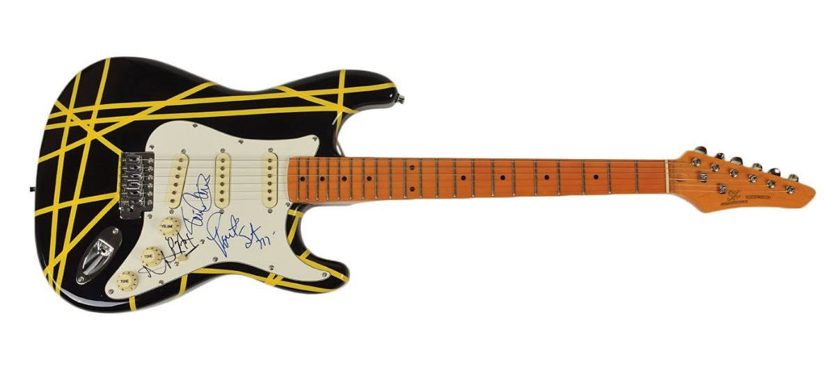 Right-handed SX Vintage Series stratocaster-style black-bodied electric guitar with yellow tape design, signed on the white pickguard in black or blue felt tip by Michael Sweet, Robert Sweet, Oz Fox, and Tim Gaines. Includes gig bag. In fine condition. Accompanied by a full letter of authenticity from JSA.