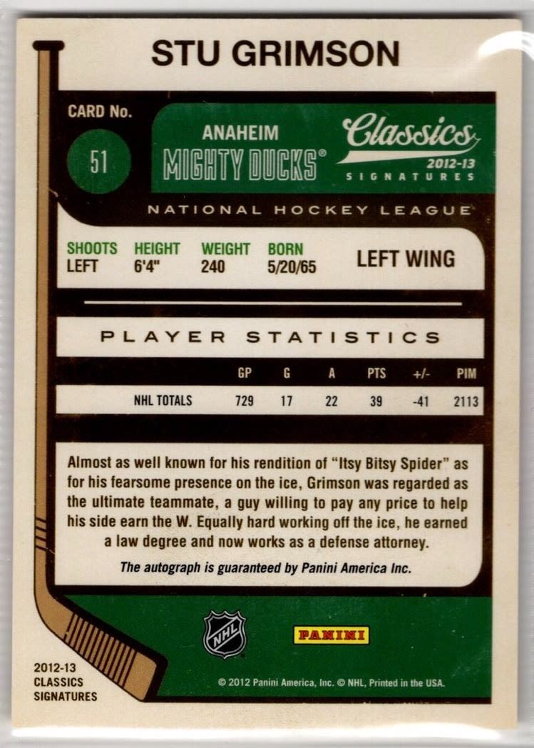 Stu Grimson 2012-13 Panini Classics Signatures On Card Auto #51