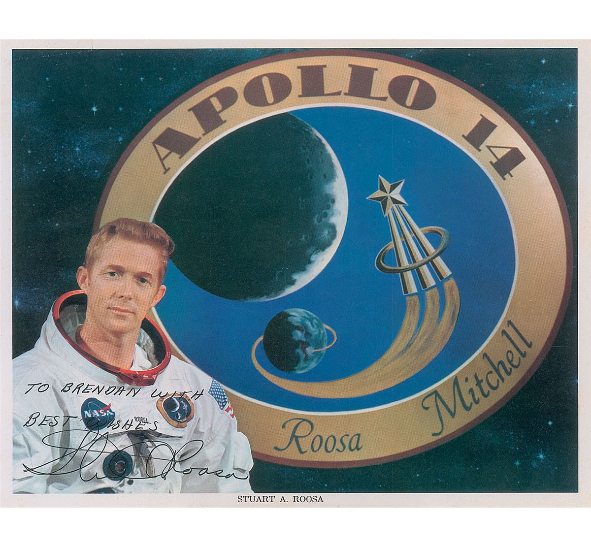 Official color 10 x 8 NASA lithograph of Roosa posing in his white space suit with the Apollo 14 mission emblem in the background, signed and inscribed in black ink, “To Brendan, with best wishes, Stu Roosa.” In fine condition.