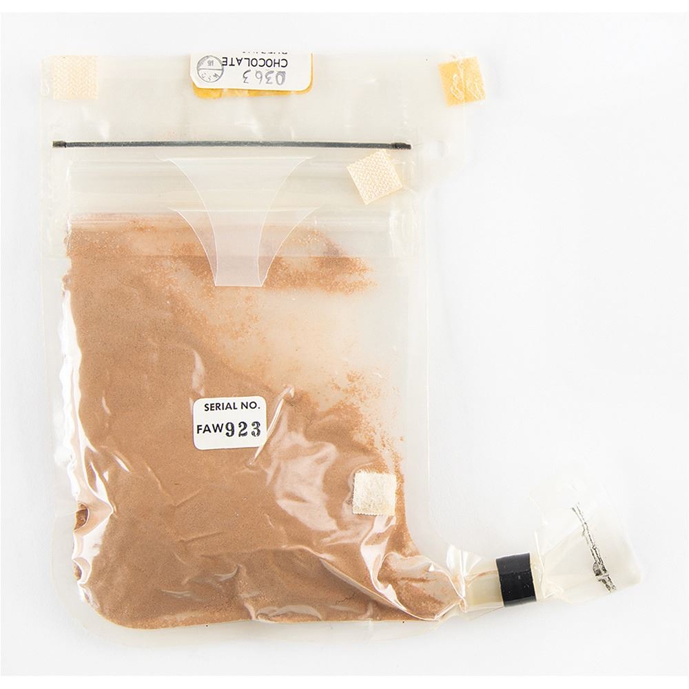 From the personal collection of astronaut Stuart A. Roosa's daughter‰ÛÓa flown package of chocolate pudding that was carried into lunar orbit during the Apollo 14 mission. The package measures 7.25 x 7.25 and features two parts labels: "0363, Chocolate Pudding, 4 oz. cold water, 5-15 minutes" and "Serial No. FAW 923." The package also bears four small swatches of Velcro; their white color indicates that this candy belonged to CMP Roosa. Each Apollo 14 astronaut's consumables were identified with a different color of Velcro, with the Commander in red, the Command Module Pilot in white, and the Lunar Module Pilot in blue-representing the colors of the United States flag. The Velcro was used to attach the food to the spacecraft while floating in zero gravity to the moon and back. In fine condition.