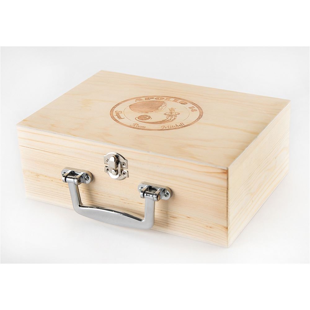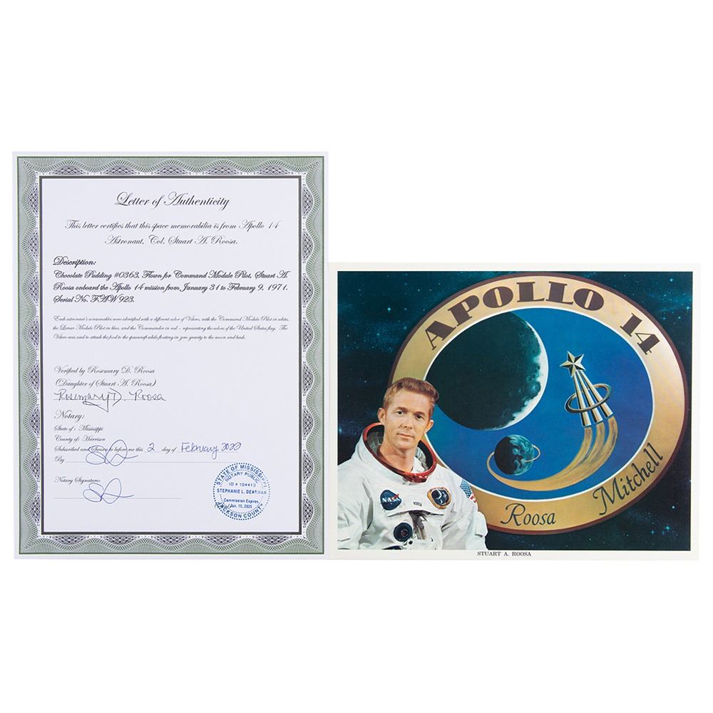 Accompanied by an official NASA lithograph of Roosa in his white space suit, a wooden display box with lid etched with the Apollo 14 insignia, and a notarized letter of authenticity from Roosa's daughter, Rosemary, who attests: "This letter certifies that this space memorabilia is from Apollo 14 Astronaut, Col. Stuart A. Roosa‰Û_Chocolate Pudding #0363, Flown for Command Module Pilot, Stuart A. Roosa onboard the Apollo 14 mission from January 31 to February 9, 1971. Serial No. FAW 923."