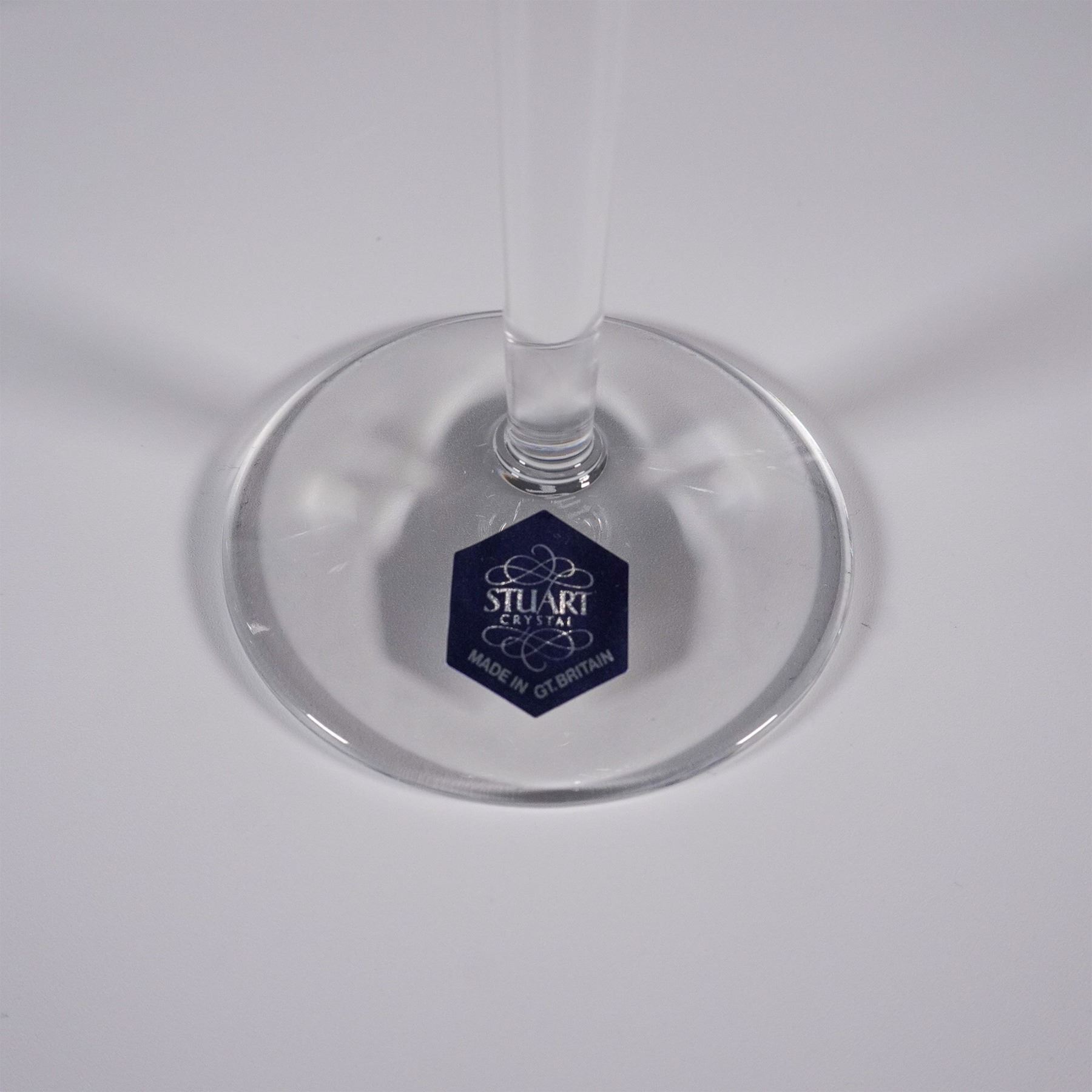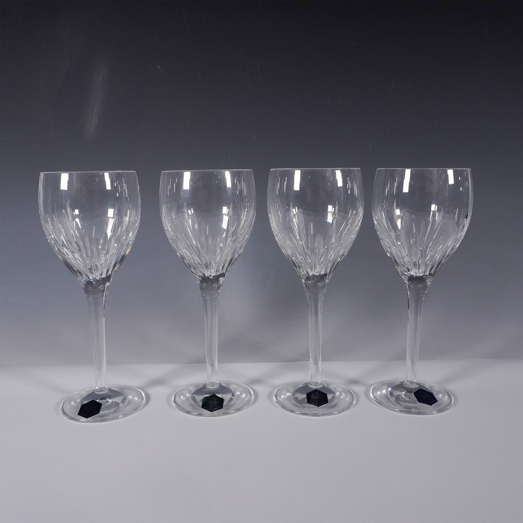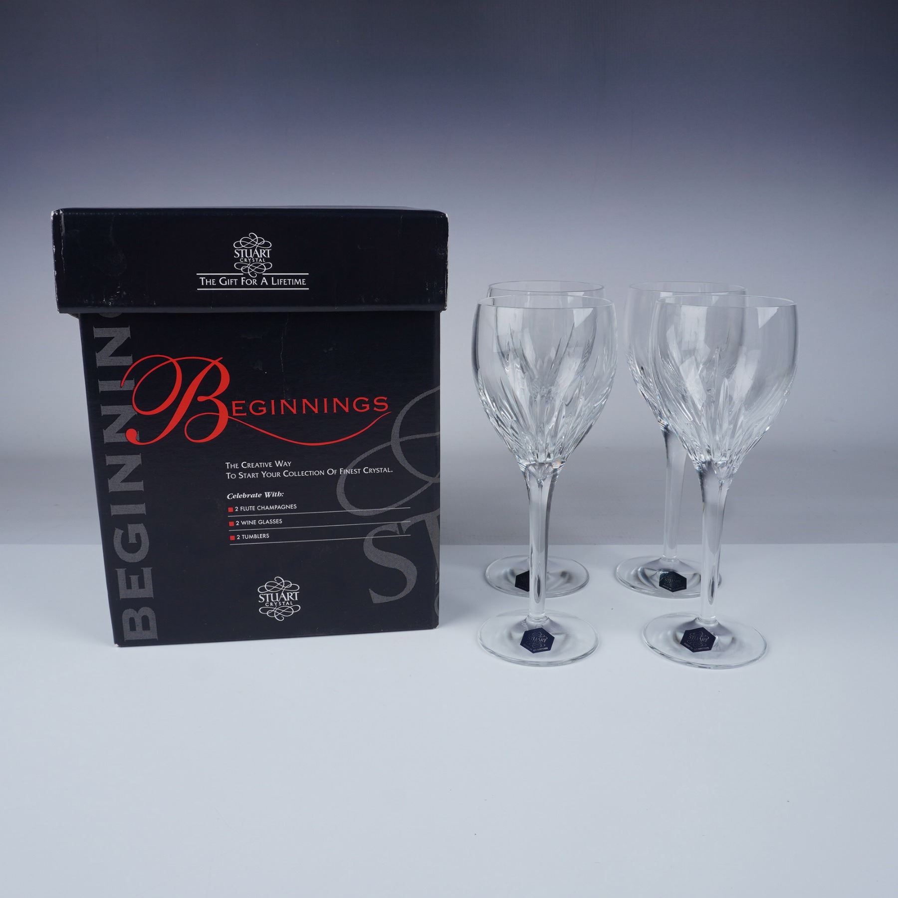 This set of four elegant wine glasses from Stuart Crystal's Beginnings collection showcases the brand's renowned craftsmanship. Each glass features intricate cut patterns that enhance the brilliance and clarity of the fine crystal. Made in Great Britain, these glasses come in their original box, with each piece retaining the original Stuart Crystal label. This collection is an excellent addition for crystal enthusiasts or as a thoughtful gift.