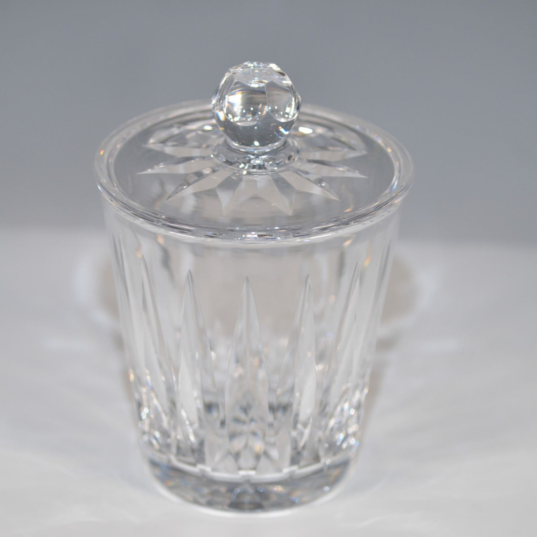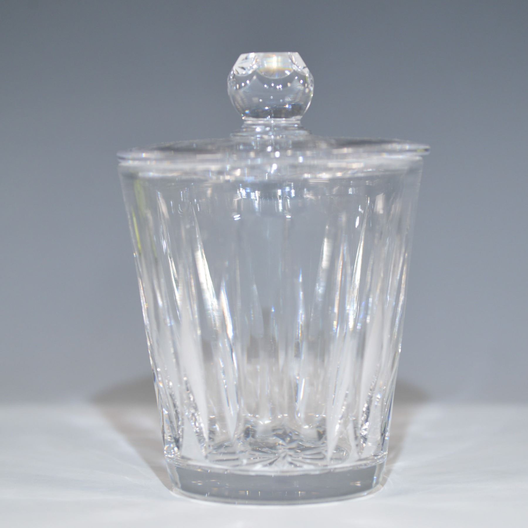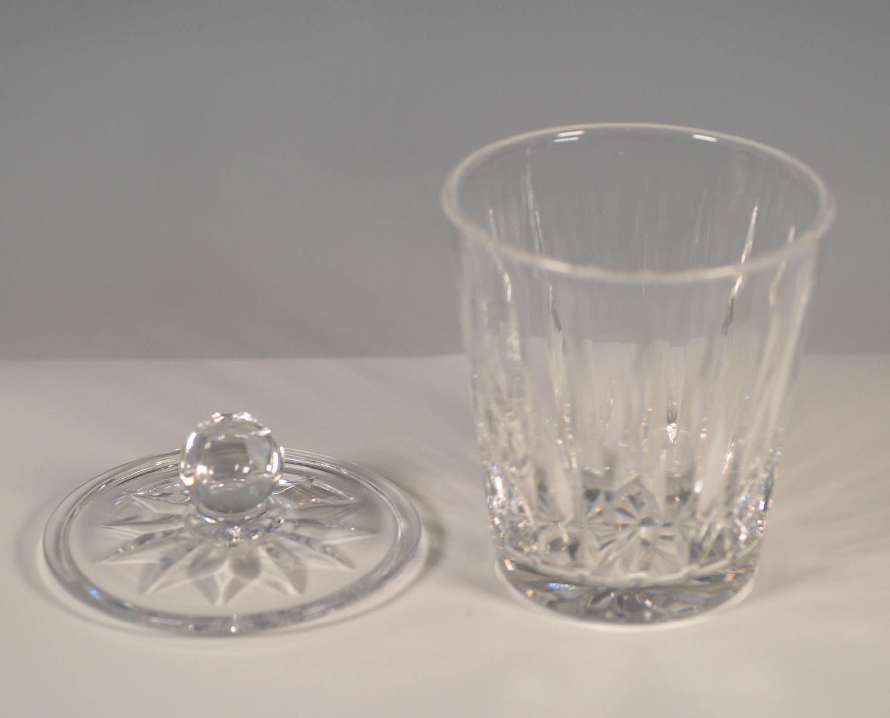 Elegant Stuart Crystal lidded jar featuring a vertical facet design, starburst base, and faceted finial. A fine example of British craftsmanship, Stuart Crystal was renowned for its high-quality cut glass before joining the Waterford Group in 1995. A timeless collectible for fine glassware enthusiasts.