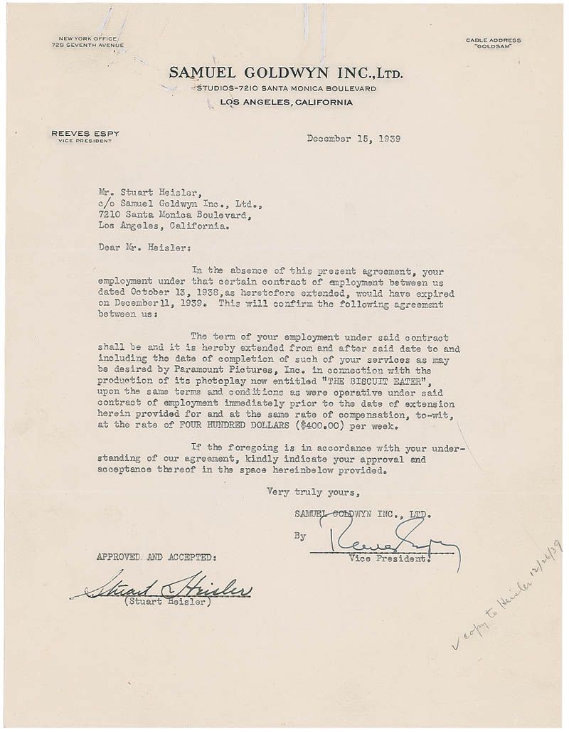 Director (1896–1979) known for his WWII propaganda recruitment piece, The Negro Soldier, and Tulsa which was nominated for an Oscar. DS, one page, 8.5 x 11, December 15, 1939. An extension of the agreement between Heisler and Samuel Goldwyn Inc. “in connection with the production of its photoplay now entitled ‘The Biscuit Eater,’…at the rate of four hundred dollars ($400.00) per week.” Two horizontal folds, numerous paperclip marks and impressions to the upper border, and an original pencil office notation, otherwise fine condition.