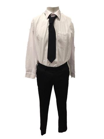Stuart Long (Mark Wahlberg) screen worn, "Ferrecci" , white seminary dress shirt(L), black "Haggar" seminary pants and black seminary tie. Includes wardrobe tag. From the seminary entrance/corridor scene.