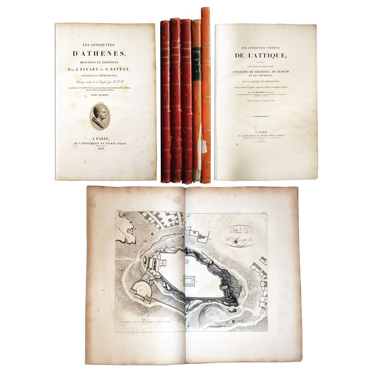 Five gorgeous folio volumes comprise the landmark works that brought about the Neoclassical period in architecture. Combined, the volumes contain hundreds of etchings and plates drawn to scale, including such monumental icons of Grecian architecture as the Acropolis. The first four of the heavily illustrated volumes are ''Antiquites d'Athenes,'' published by CP Landon: Paris: 1808, 1810, 1812, & 1822. Architects and painters James Stuart and Nicolas Revett were the first to create a detailed architectural survey of the ruins of Athens, which they published in English in 1762. This is the first French-language translation, printed to meet demand as Neoclassicism ignited across Europe. Complemented by the fifth tome in the lot, which is heavily illustrated with meticulous scale drawings of the structures surviving in the ancient Attica region on the southeast coast: ''Les Antiquites Inedites de l'Attique.'' Published by Firmin Didot Freres: Paris: 1832. This volume was crafted by the Society of the Dilettanti and translated to French by Hittorff. The 18th century art and architectural world was ripe for a backlash against the elaborate melodrama and excesses of the preceding Rococo and Baroque periods, and these books directly inspired the active return to the idealistic simplicity of Greek classical style. The four Stuart/Nicolas volumes all measure 12.25'' x 18.25''. Volumes 1-3 are bound in red half morocco with gilt accents, and Volume 4 is bound in tangerine leather boards with gilt accents. Volume 4 shows leather loss to the backstrip exposing about 2'' of the spine at its base. The Dilettanti book is bound in tangerine textured paper boards and measures 13'' x 19.5''. It shows a few inches of cracking to the front exterior hinge from the bottom edge, and a chip to the lower quarter of the backstrip. The expected foxing, toning, and light staining to leaves are present throughout the series, as are scattered abrasions to the exteriors. All five books are in very good condition, especially given age. An impressive collection.