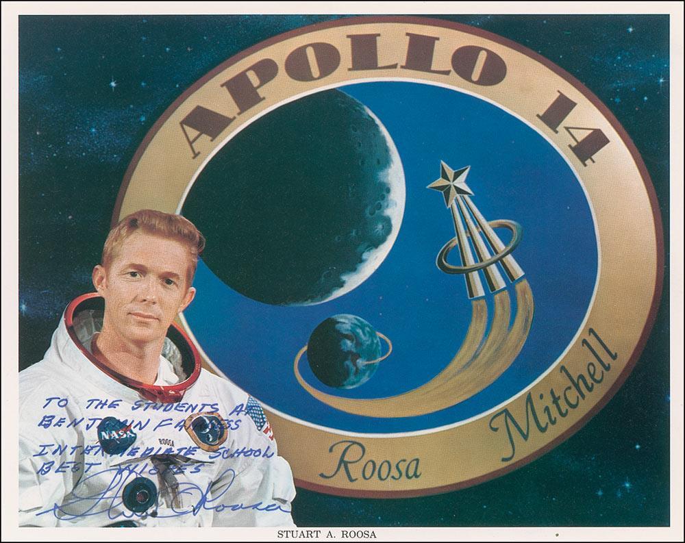 Color 10 x 8 NASA photo of Roosa posing in front of the Apollo 14 mission emblem, signed and inscribed in blue felt tip, “To the Students at Benjamin Fairless Intermediate School, Best Wishes, Stuart Roosa.” In fine condition, with light contrast to the signature.