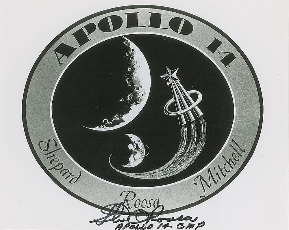 Glossy 9.75 x 7.75 NASA photo of the Apollo 14 mission emblem, signed in black felt tip, “Stu Roosa, Apollo 14 CMP.” In fine condition, with slightly trimmed edges.