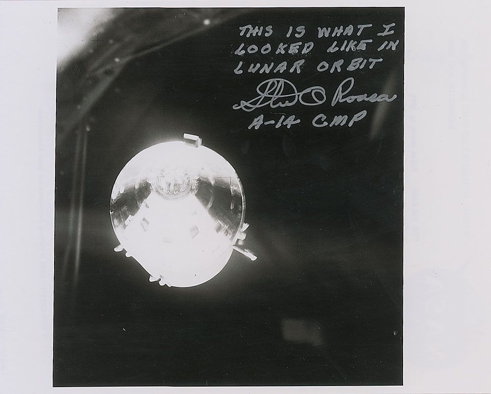Official glossy 10 x 8 NASA photo of the Apollo 14 command and service module in orbit, signed in silver paint pen, “This is what I looked like in lunar orbit. Stu Roosa, A-14 CMP.” In fine condition, with a few scattered light surface dings. From the Leslie Cantwell collection.