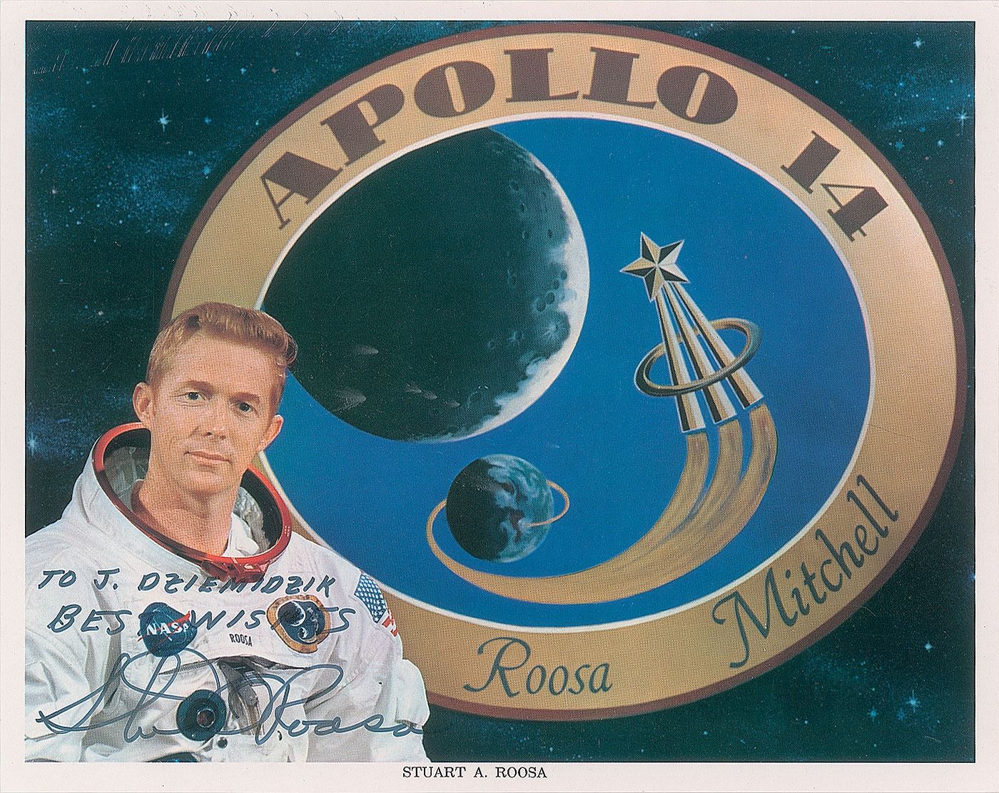 Official color 10 x 8 NASA lithograph of Roosa in his white space suit against the Apollo 14 insignia, signed and inscribed in black felt tip, "To J. Dziemidzik, Best wishes, Stuart Roosa.” In fine condition, with a few light scuffs to the image of the moon.