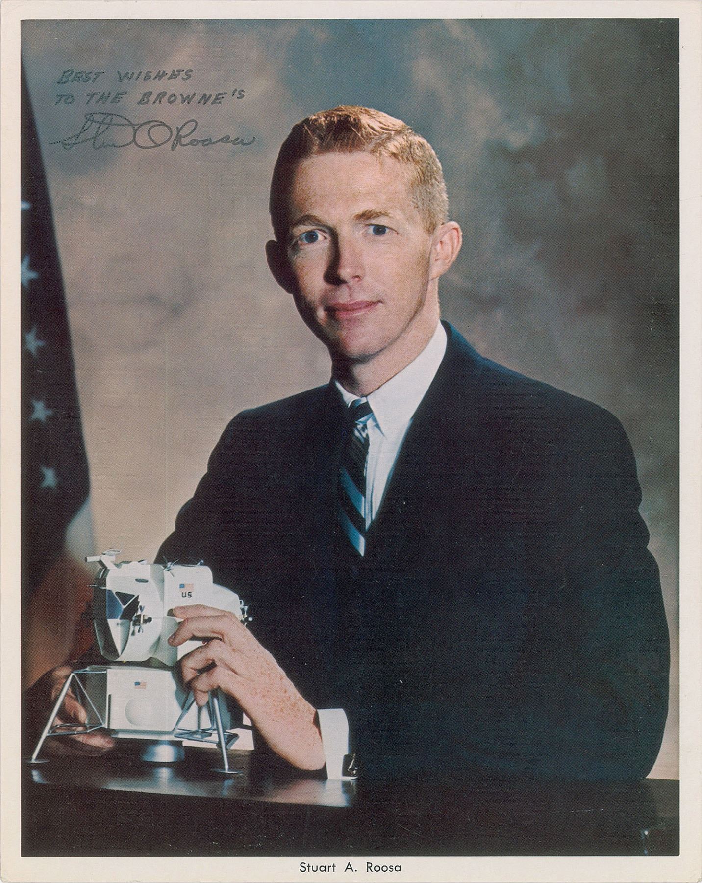Two items signed by Roosa: an official color 8 x 10 NASA lithograph of Roosa posing with a model of the Lunar Module, signed and inscribed in black felt tip, "Best wishes to the Browne's, Stu A. Roosa"; and a TLS signed "Stu A. Roosa," one page, 5.25 x 8, NASA letterhead, October 16, 1969, in part: "I am now scheduled for a trip to the moon on Apollo 14 next July and, needless to say, I am busy training for this." In overall fine condition.