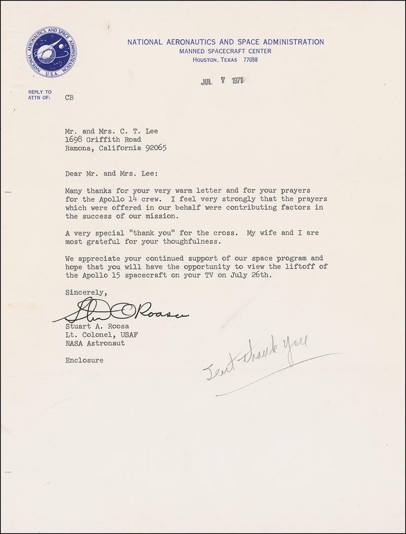 TLS, one page, 8 x 10.5, NASA letterhead, July 7, 1971. Letter of thanks to a well-wisher. In full: “Many thanks for your very warm letter and for your prayers for the Apollo 14 crew. I feel very strongly that the prayers which were offered in our behalf were contributing factors in the success of our mission. A very special ‘thank you’ for the cross. My wife and I are most grateful for your thoughtfulness. We appreciate your continued support of the space program and hope that you will have the opportunity to view the liftoff of the Apollo 15 spacecraft on your TV on July 26th.” In fine condition, with office pencil notation near bottom of page. Pre-certified Scott Cornish and RRAuction COA.