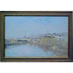 Stuart Shils, oil on board, "River Scene", see note on reverse, framed, image measures 12" x 19"