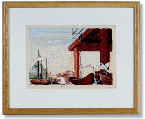 Unusual by comparison to Sutcliffe’s previous works is this peaceful and brightly lit dock scene complete with seagulls, sailboats and light blue sky. Also unusual is the lack of anything of an abstract nature. Done in (watercolor) gouache paint on paper. On the bottom border of this Liverpool Art School, homework assignment is the mark (or grade) he received “62.” 10 x 15”. EX. Framed to 18 x 22”.