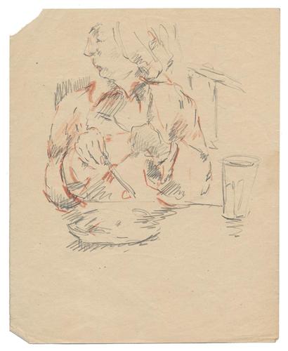 Here is another interesting sketch by Stuart Sutcliffe that may have been from his Liverpool College of Art days. This 7 x 9” pencil sketch is of a man with a knife, plate and drinking glass at a table setting. Stu used hard and broken lines in graphite pencil, and some highlights with a sepia conte crayon. We could not help but notice how the man’s face looks not unlike an exaggerated version of John Lennon himself; but that’s only our interpretation of the artwork! Done on newsprint paper. EX., with some very mild handling and a small corner tip tear.