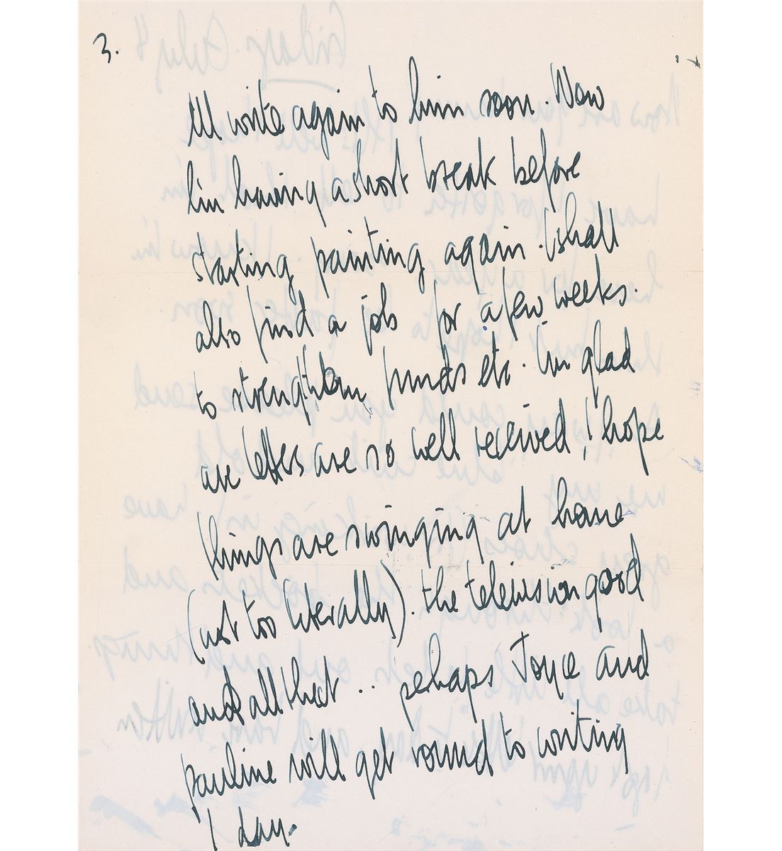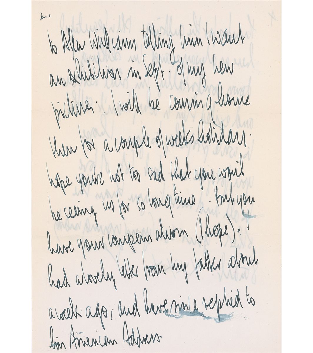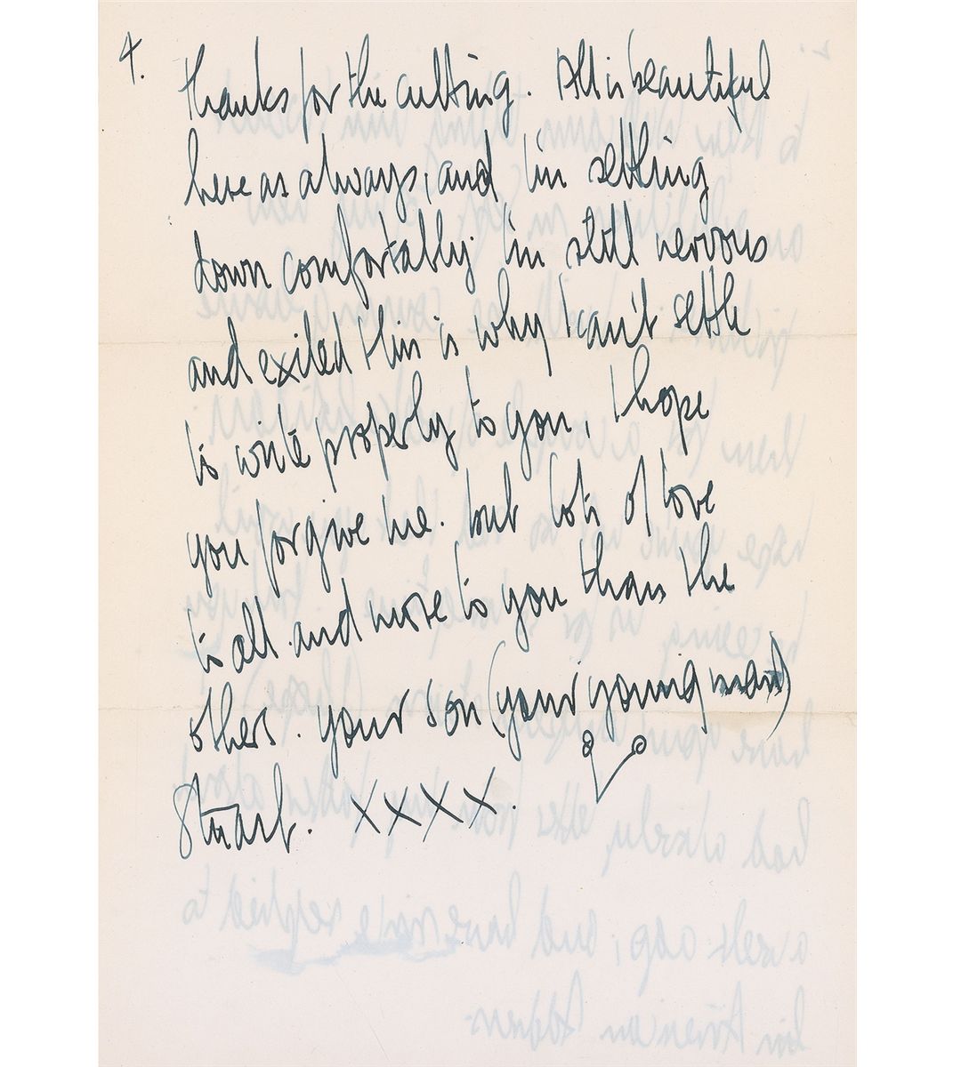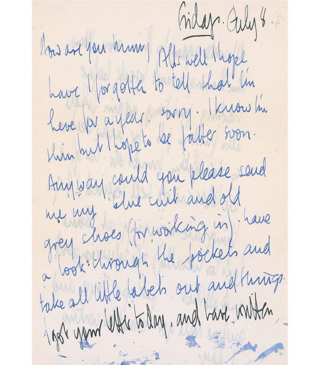 A talented fellow student of John Lennon’s at the Liverpool College of Art, Stuart Sutcliffe (1940–1962) played the bass in the first incarnation of the Beatles. He chose his passion for painting above being a Beatle and left the group to devote himself to his art career; not long after, he died of a cerebral hemorrhage at the age of twenty-one. ALS signed “Your son (your young man) Stuart xxxx,” two pages both sides, 8.25 x 11.75, July 8. Letter to his mother, with Sutcliffe switching from blue to black ink during the process of writing, in full: “All’s well I hope. Have I forgotten to tell you that I’m here for a year, sorry. I know I’m thin but I hope to be fatter soon. Anyway could you please send me my blue suit and old grey shoes (for working in). Have a look through the pockets and take all little labels out and things. I got your letter today, and have written to Allan William telling him I want an exhibition in Sept. of my new pictures. I will be coming home then for a couple of weeks holiday. Hope you’re not too sad that you won’t be seeing us for so long time. But you have your compensation (I hope). I had a lovely letter from my father about a week ago, and have since replied to his American Address. I’ll write to him again soon. Now I’m having a short break before starting painting again. I shall also find a job for a few weeks to strengthen funds etc. I’m glad our letters are so well received, I hope things are swinging at home (not too literally) the television good and all that…perhaps Joyce and Pauline will get around to writing 1 day. Thanks for the cutting. All is beautiful here as always, and I’m settling down comfortably. I’m still nervous and excited this is why I can’t settle to write properly to you. I hope you forgive me, but lots of love to all and more to you than the others.” Accompanied by the original mailing envelope, addressed in Sutcliffe’s hand to “Mrs. M. C. Sutcliffe.” Envelope is also signed on the reverse by Sutcliffe’s girlfriend, Astrid Kirchherr,”Kiss from your Astrid.” In fine condition, with two horizontal folds, several small areas of brushing and ink smudges, not affecting legibility, and a few small creases. Accompanied by a certificate of authenticity from Sutcliffe’s estate.