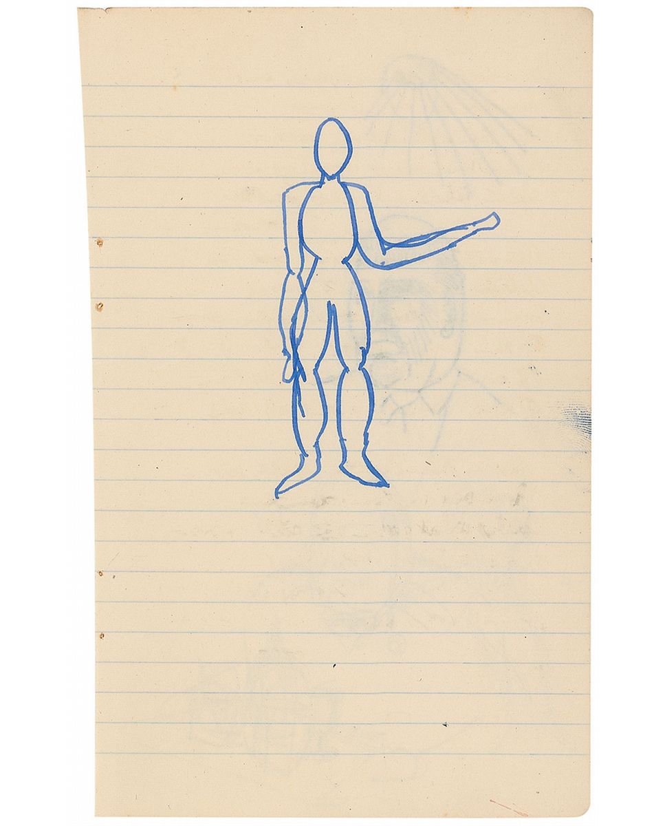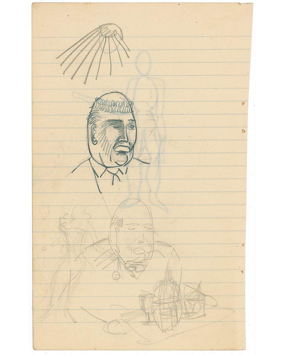 Original unsigned pencil and ink sketches on an off-white 4.5 x 7.5 lined page from one of Sutcliffe’s art school sketchbooks. On one side he draws two images of a balding man, one in ink and the other in pencil, as well as what looks like a closed eye with eyelashes; the reverse has a standing human figure with its arm outstretched. In fine condition. Sutcliffe’s sketchbooks were submitted as an application for admission to the Royal College of Art, and were the property of the Sutcliffe estate, sold at Bonham’s in July 2003.