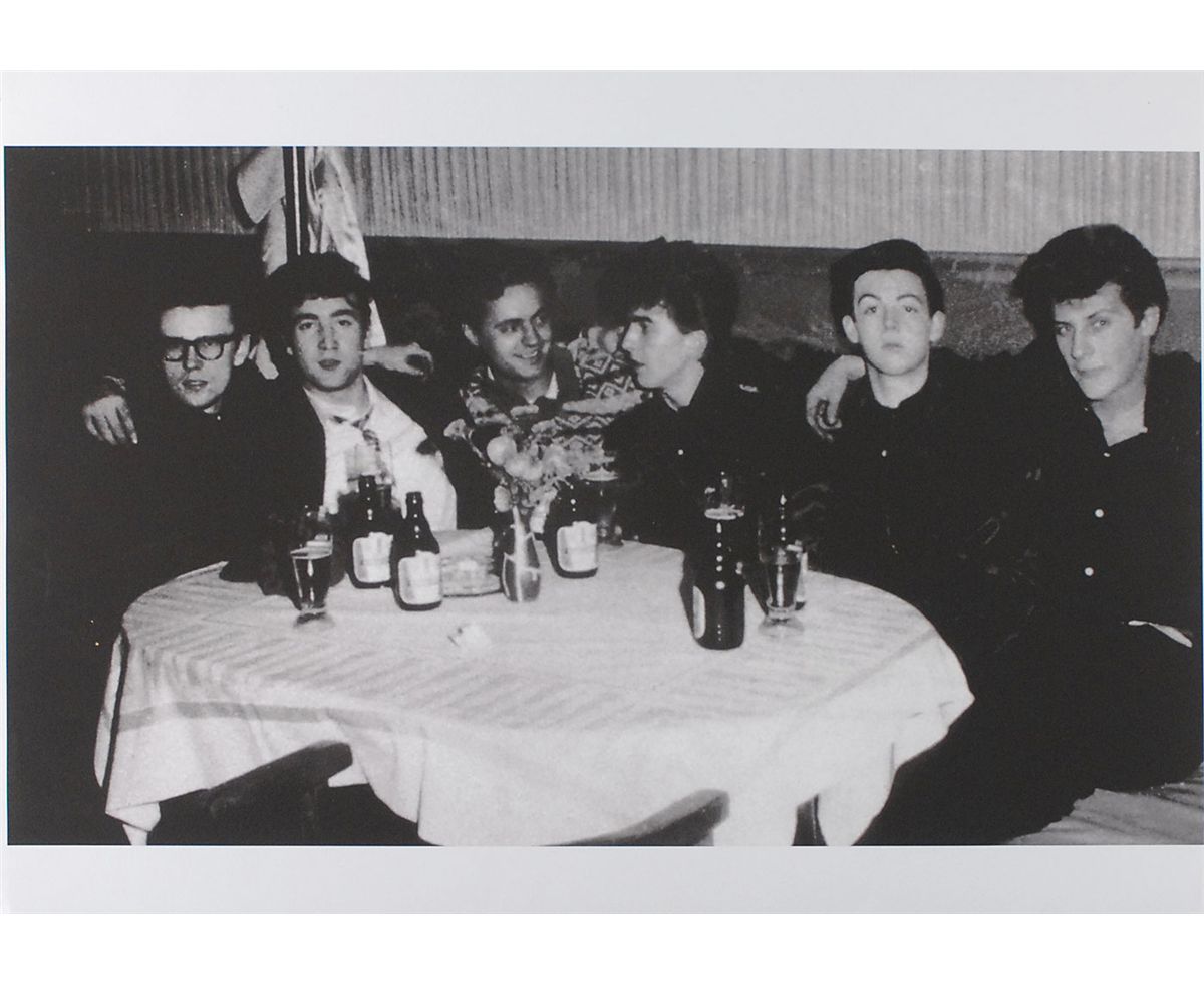 High quality 24 x 17 giclee print of an early portrait of the Beatles (Stuart Sutcliffe, John Lennon, George Harrison, Paul McCartney, and Pete Best) sitting around a table with a friend. In fine condition. Accompanied by a certificate of authenticity from Sutcliffe’s estate.