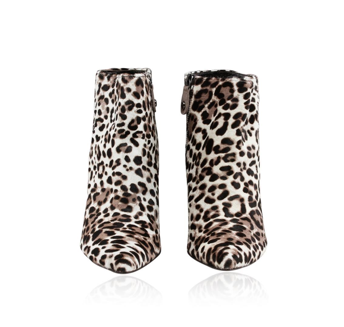 One Stuart Weitzman Hitimes pointed toe ankle boot featuring: Animal print calf hair, leather lining and sole, and side zip closure for ease of dress. Heel height: 3.5". Size 9.0, width M.