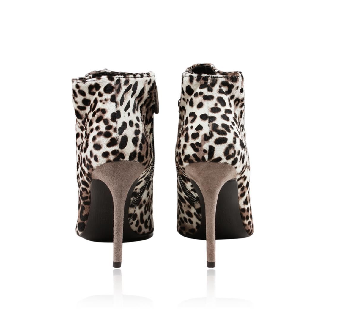 One Stuart Weitzman Hitimes pointed toe ankle boot featuring: Animal print calf hair, leather lining and sole, and side zip closure for ease of dress. Heel height: 3.5". Size 9.0, width M.